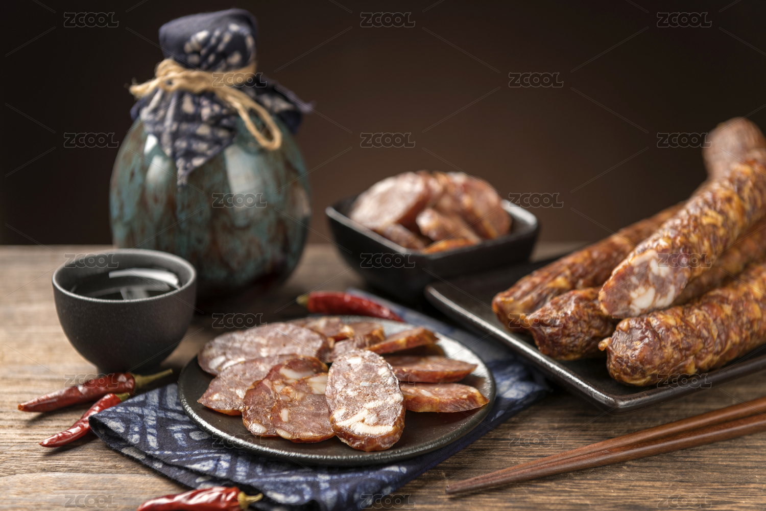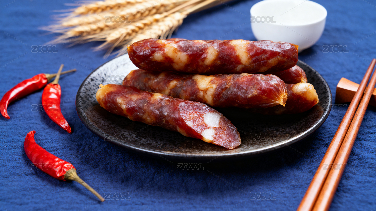 腊肠配辣椒竹筷摆盘