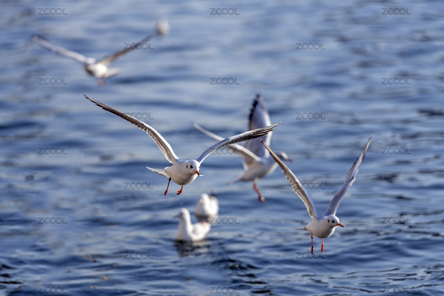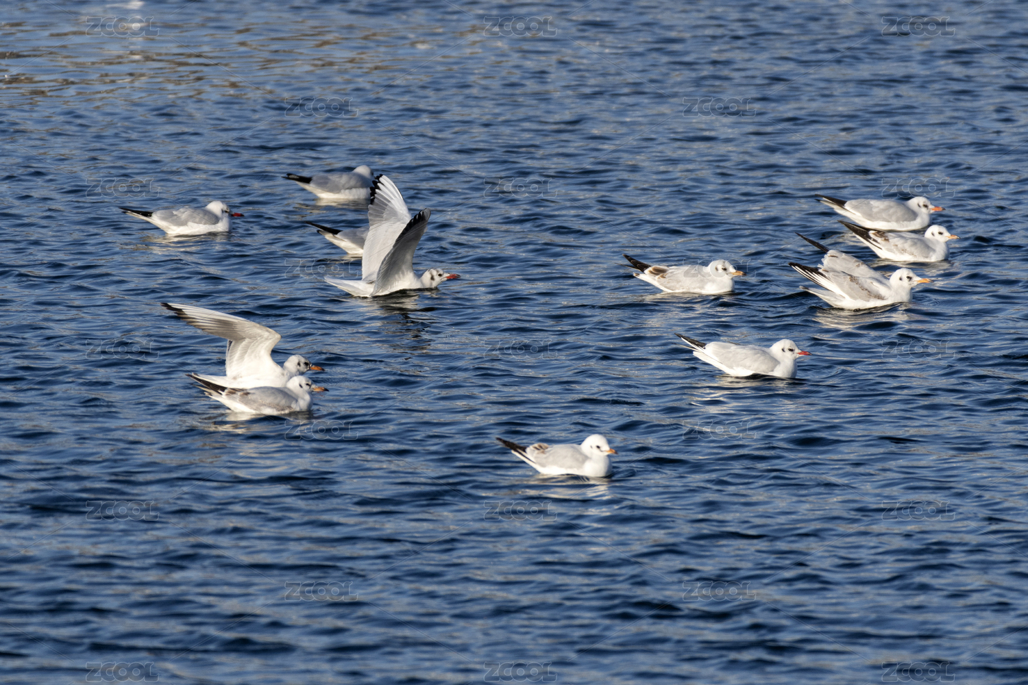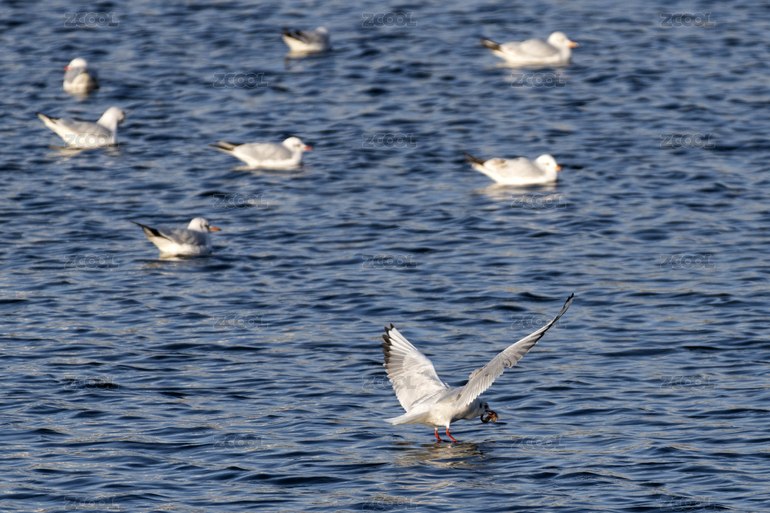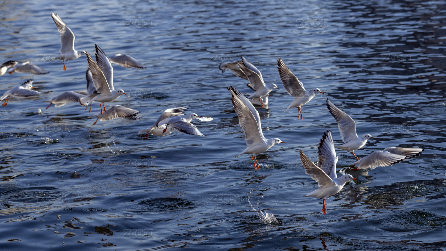 红嘴海鸥在水面上自由飞翔追逐觅食嬉戏