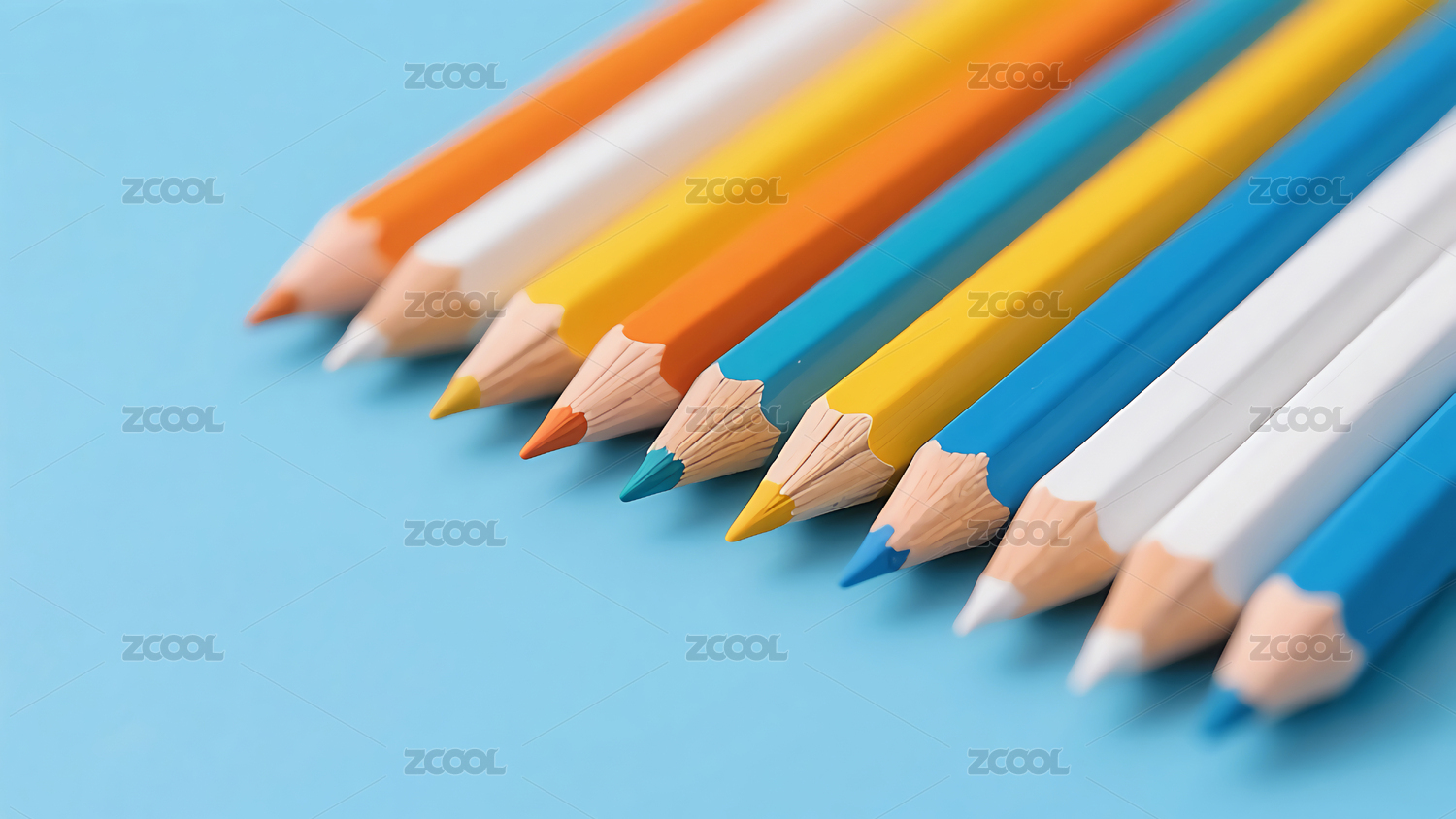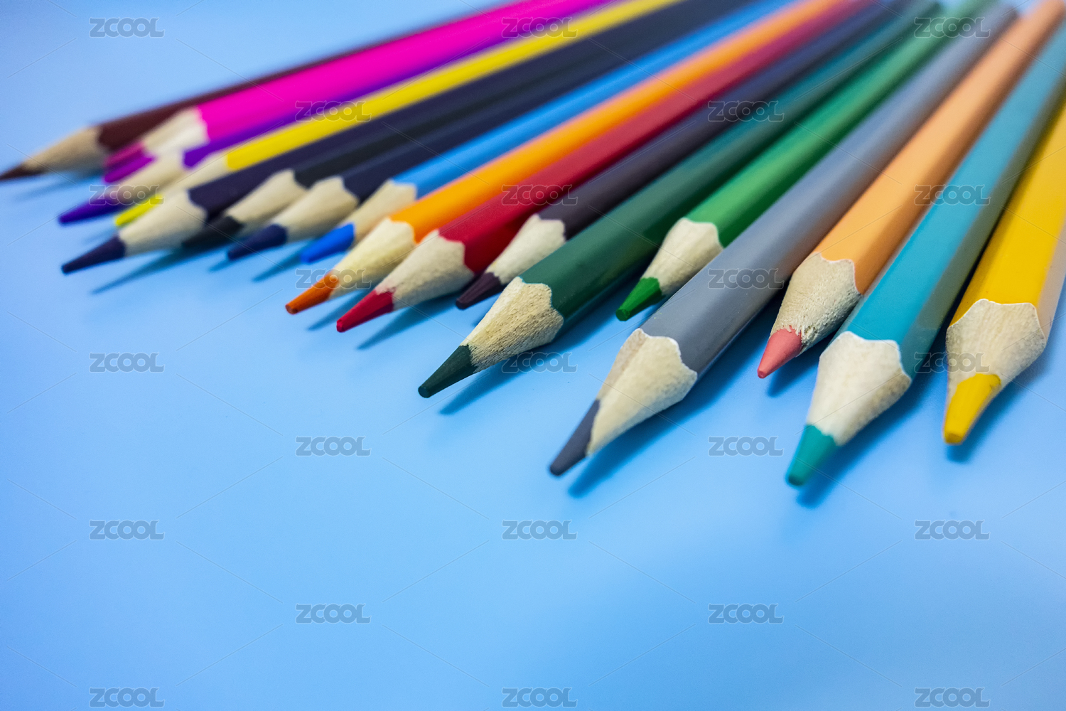 整齐排列的彩色铅笔笔头特写,蓝色背景
