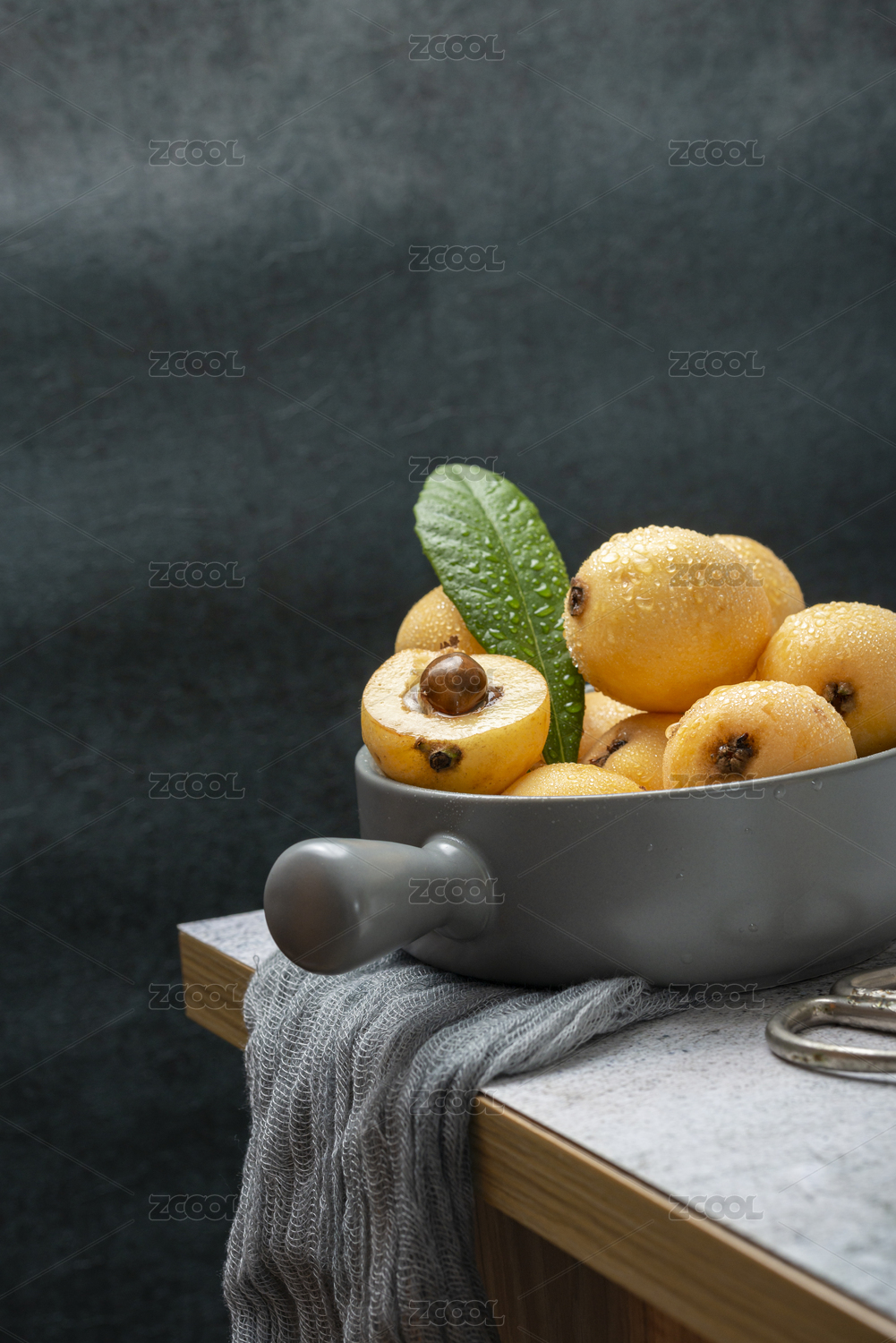 台面上摆放的新鲜水灵的枇杷和几片枇杷叶