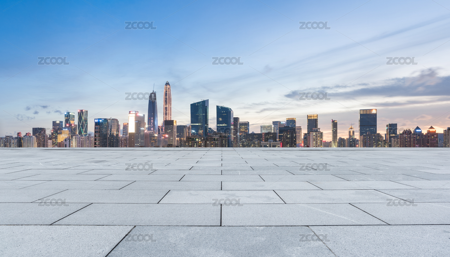 黄昏时分,前景为石砖道路的郑州城市景观和城市天际线