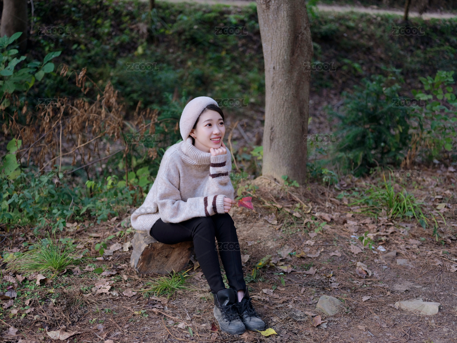 秋天午后,亚裔女性在森林公园中