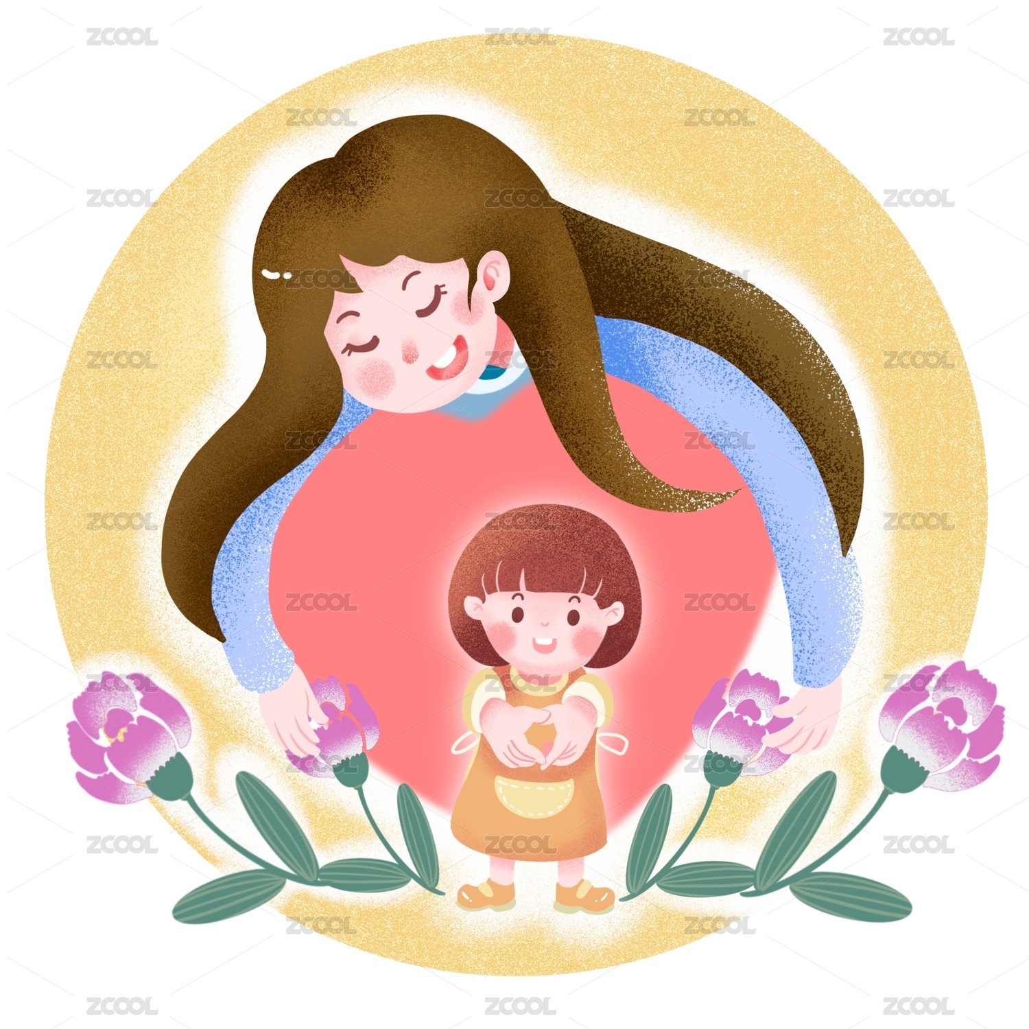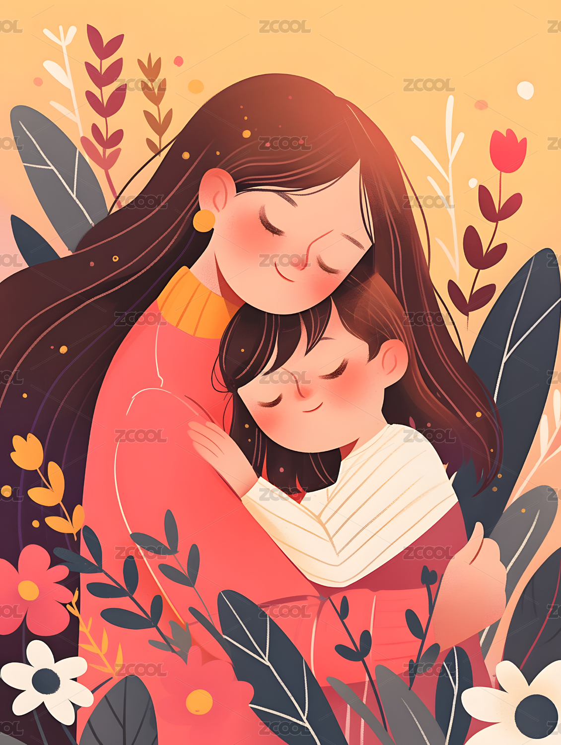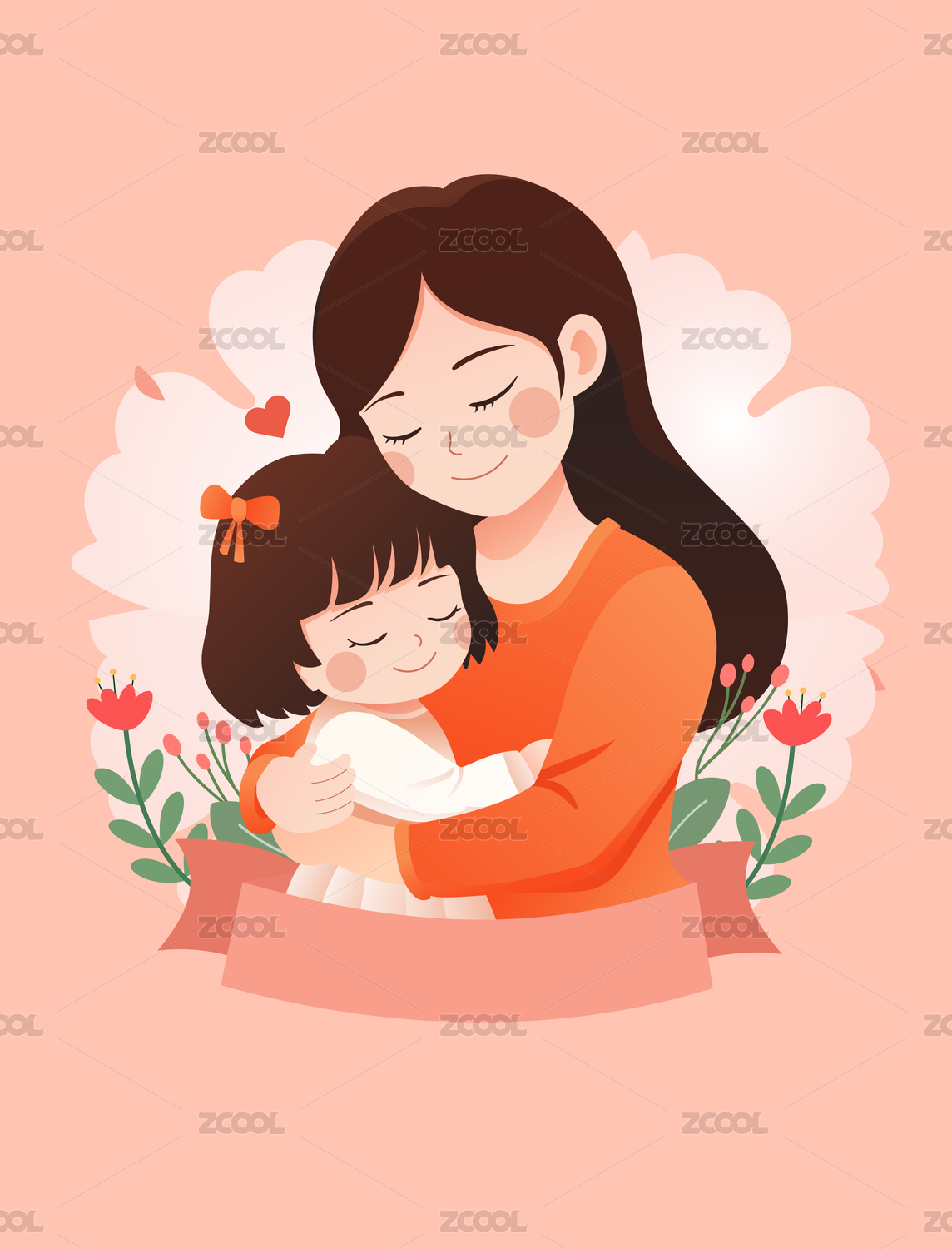 母亲节母女拥抱插画感恩节家人庆祝活动海报