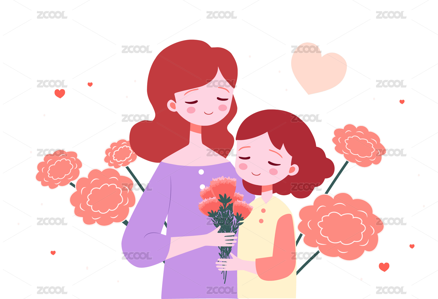 手绘矢量插画 女儿给妈妈送康乃馨 母亲节