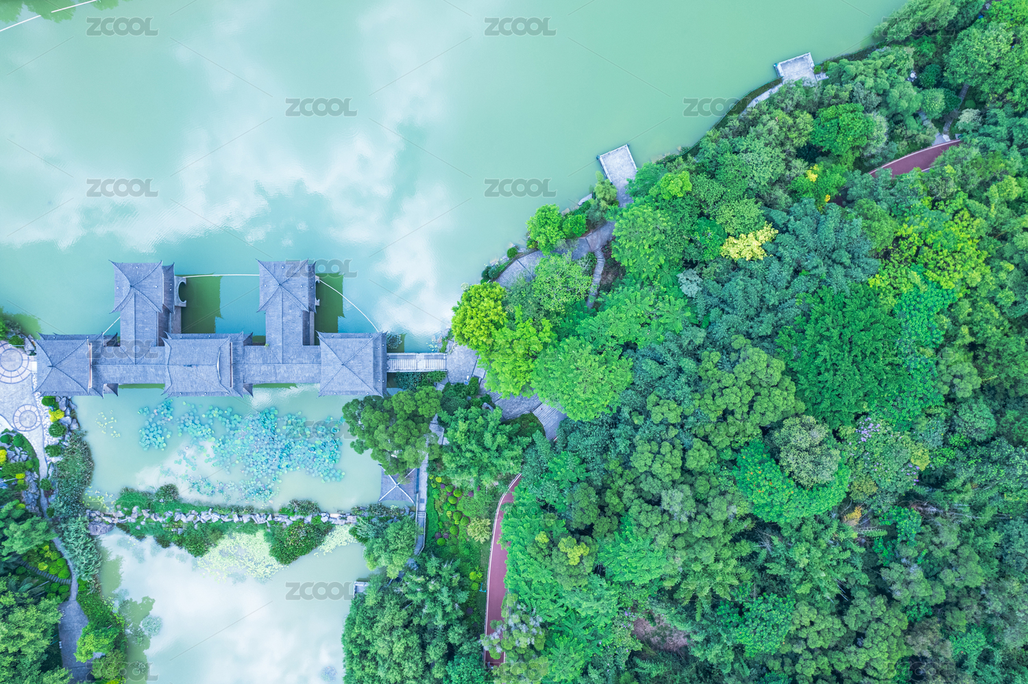 广西南宁狮山公园湖泊树林竹影桥航拍