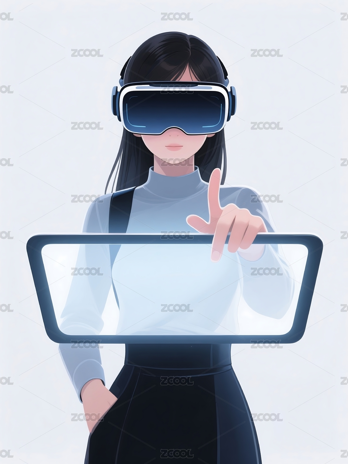 深蓝色动漫未来科技插画 虚拟少女点击按钮