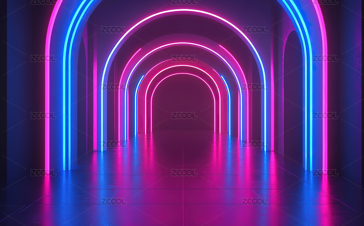 三维渲染蓝紫色霓虹灯拱门室内空间