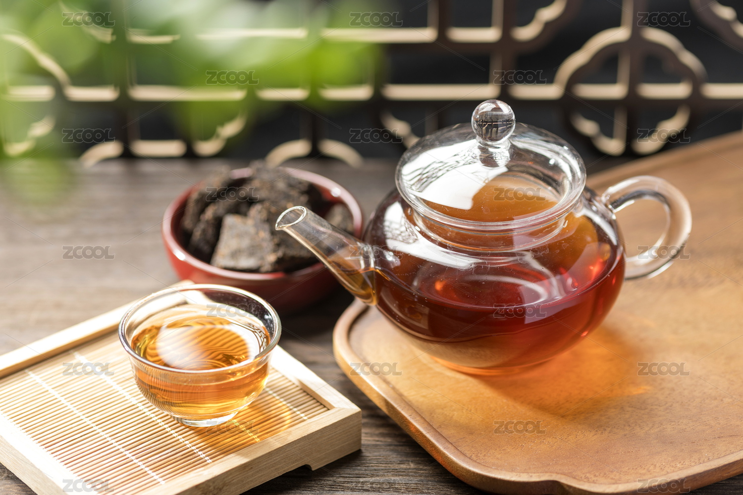 普洱茶与玻璃茶壶茶杯茶水特写木桌面背景