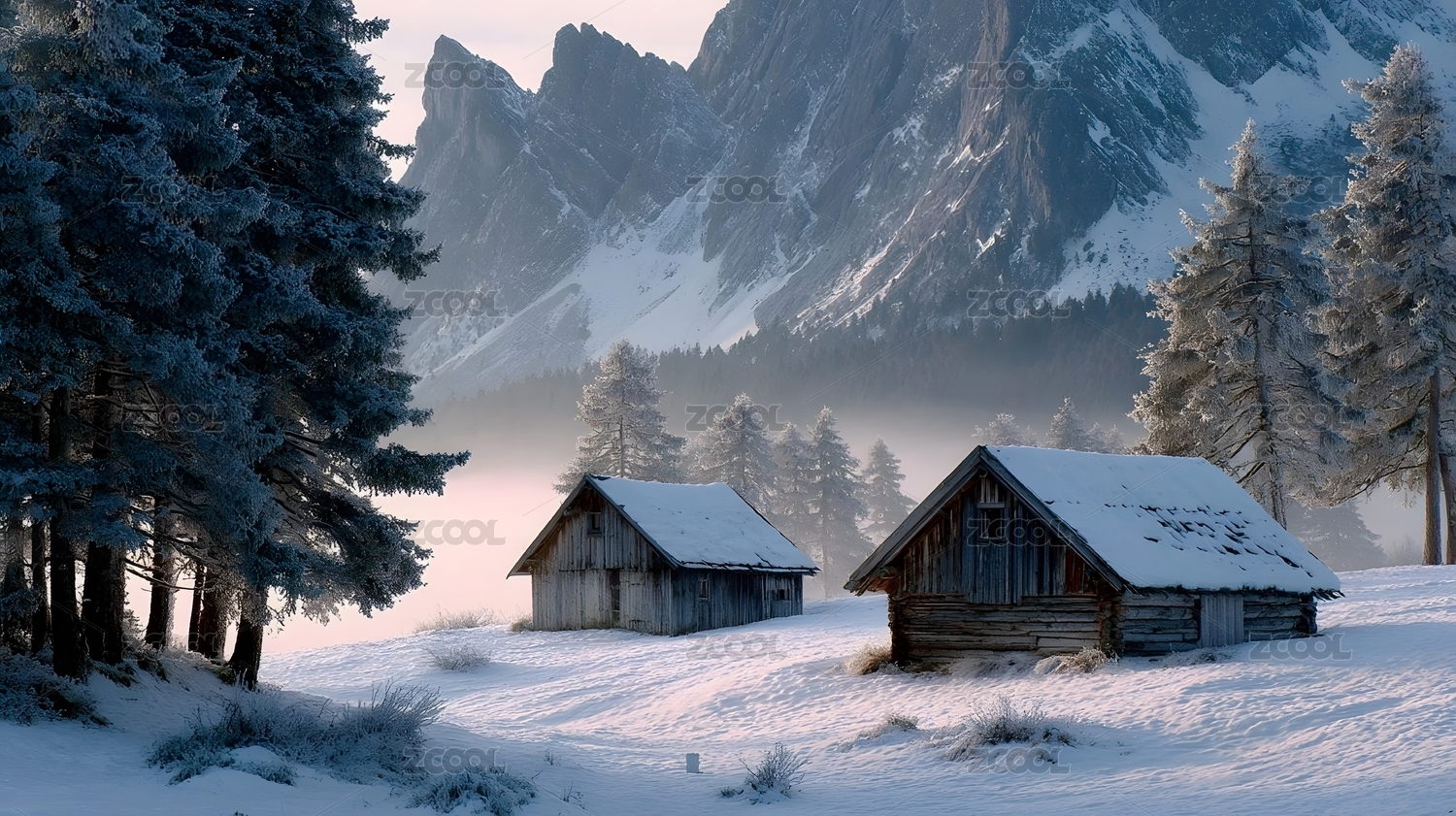 雪覆山间木屋冬日静谧风光