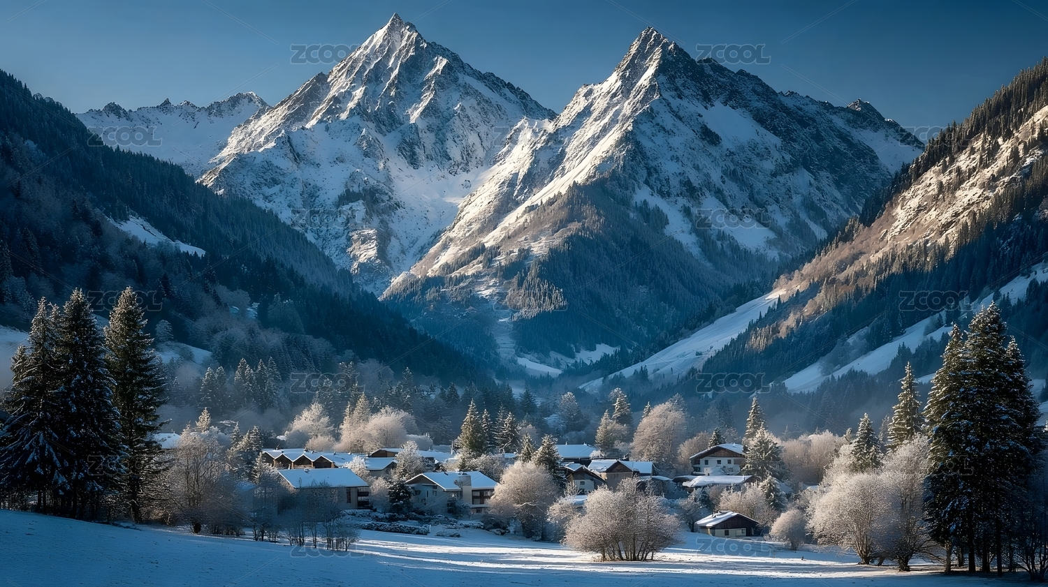 白雪皑皑的山上的树木和房屋