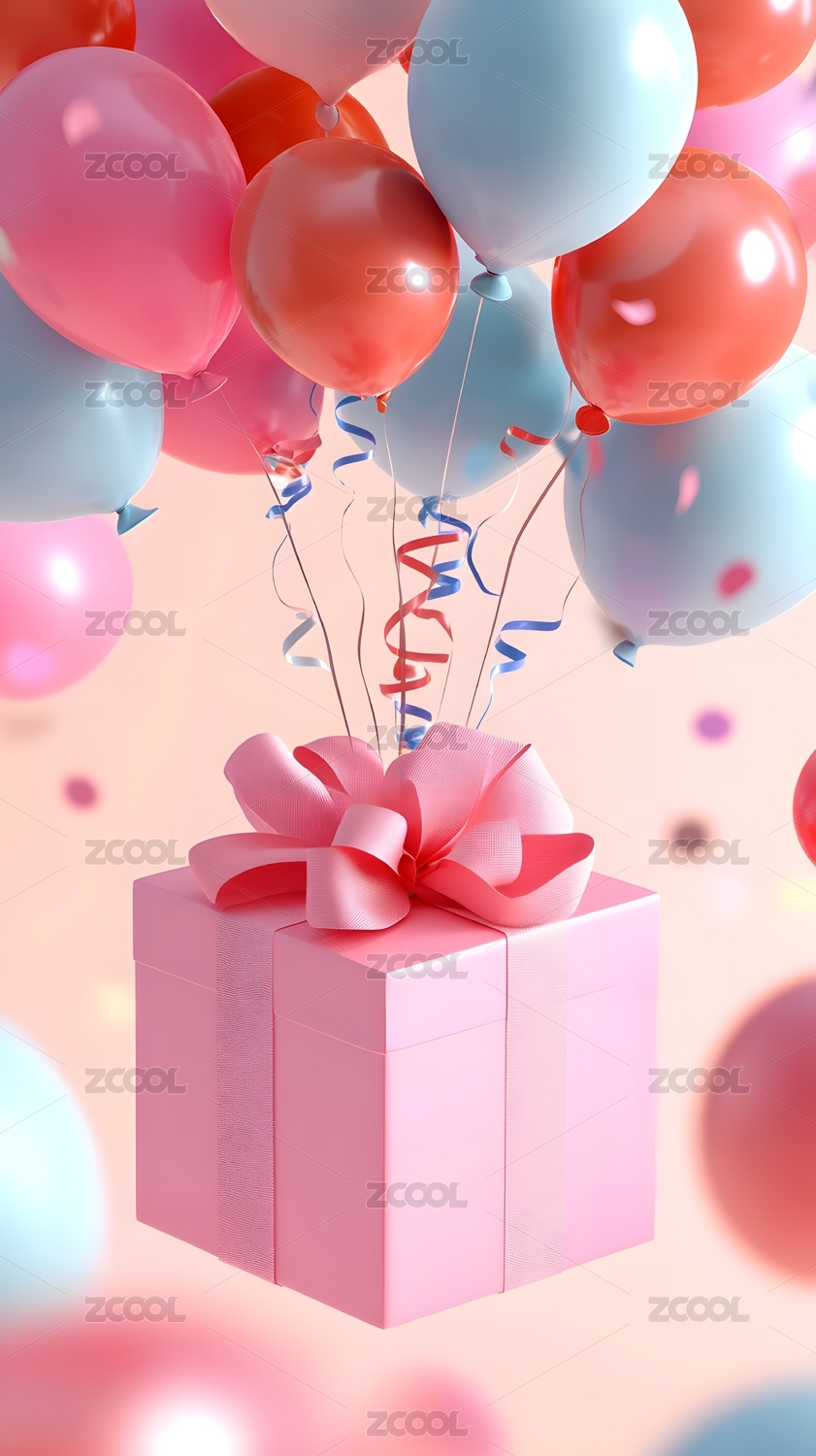 带粉色丝带和气球的礼品盒