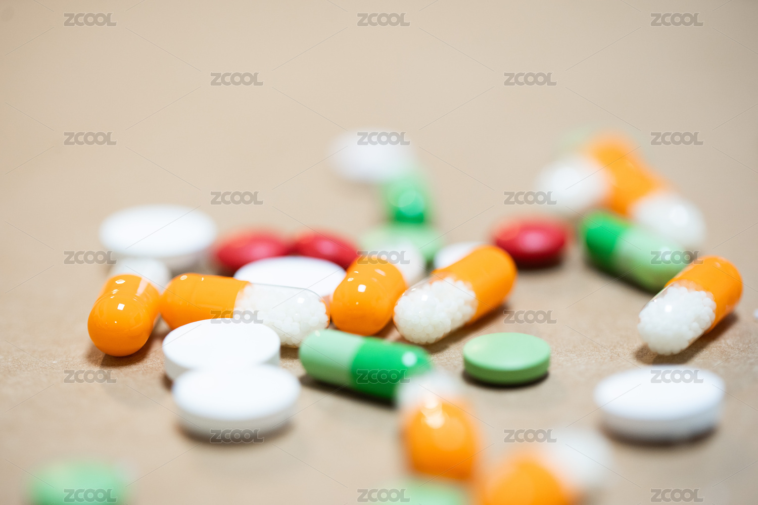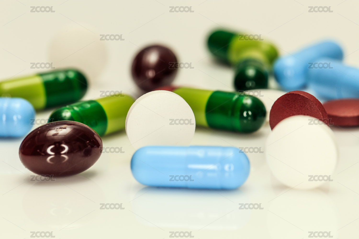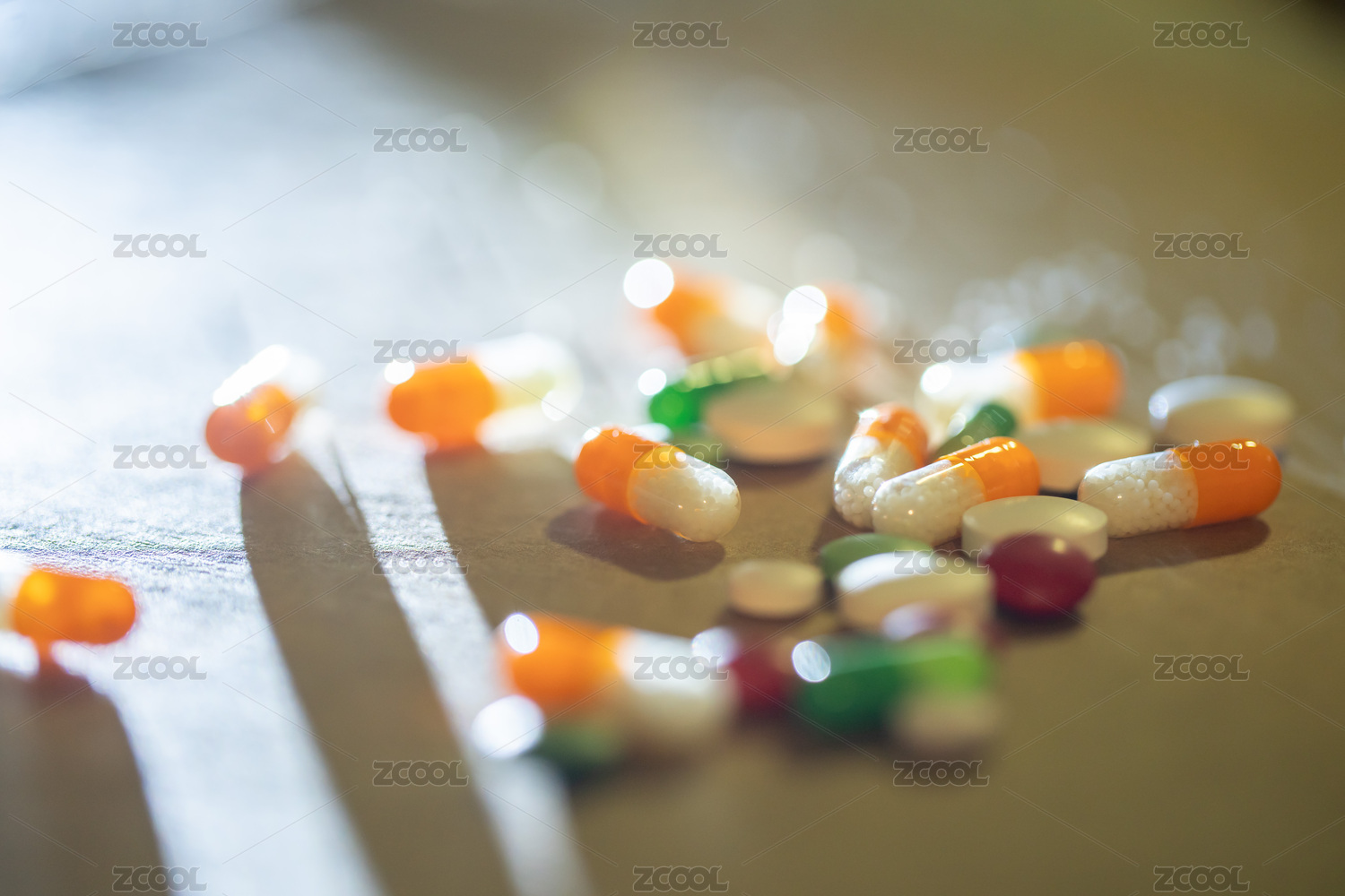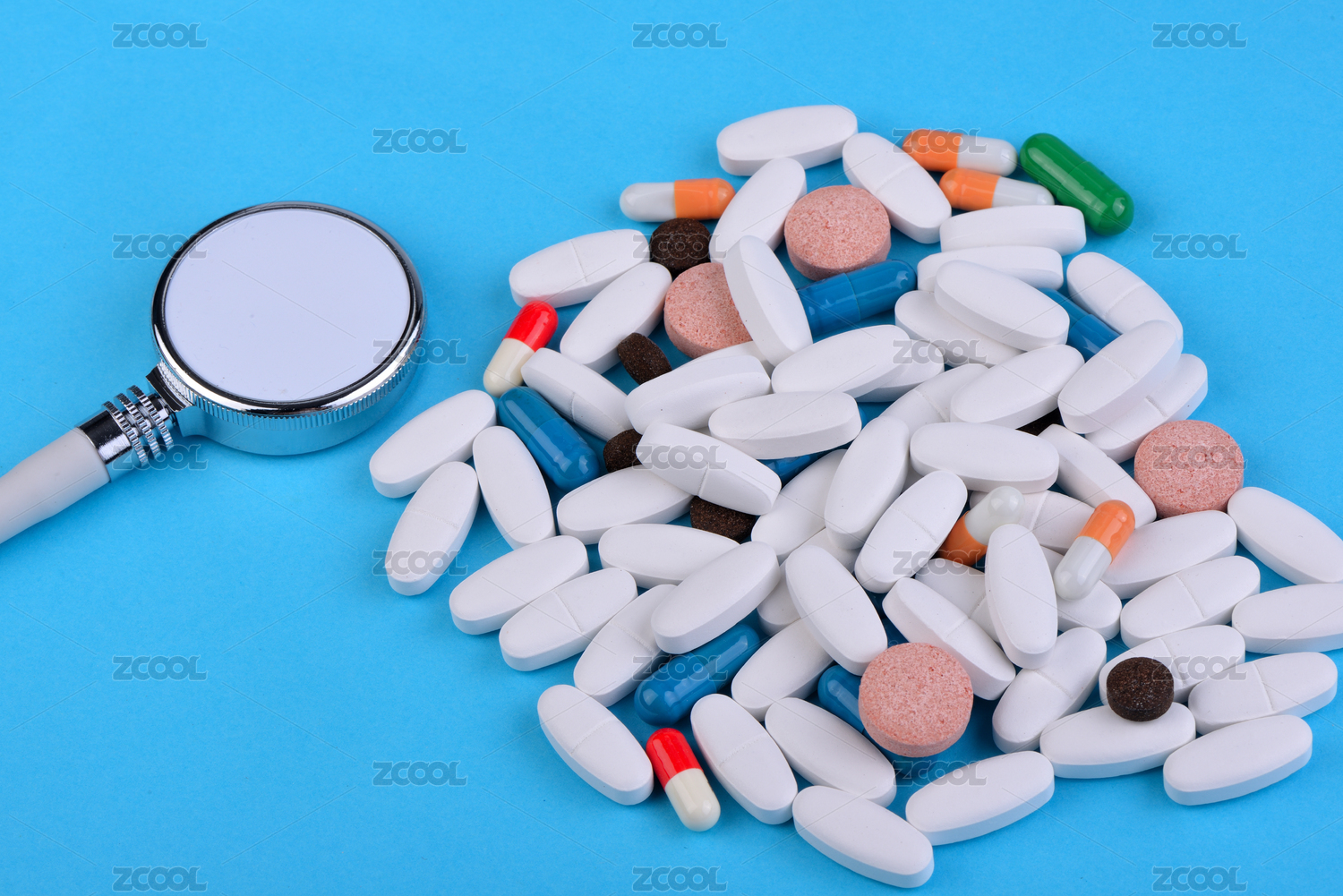 在蓝色背景上的用于医疗治疗用的中西药胶囊