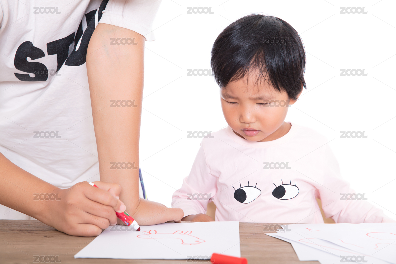 年轻的妈妈或幼教老师在认真的辅导小女孩画画