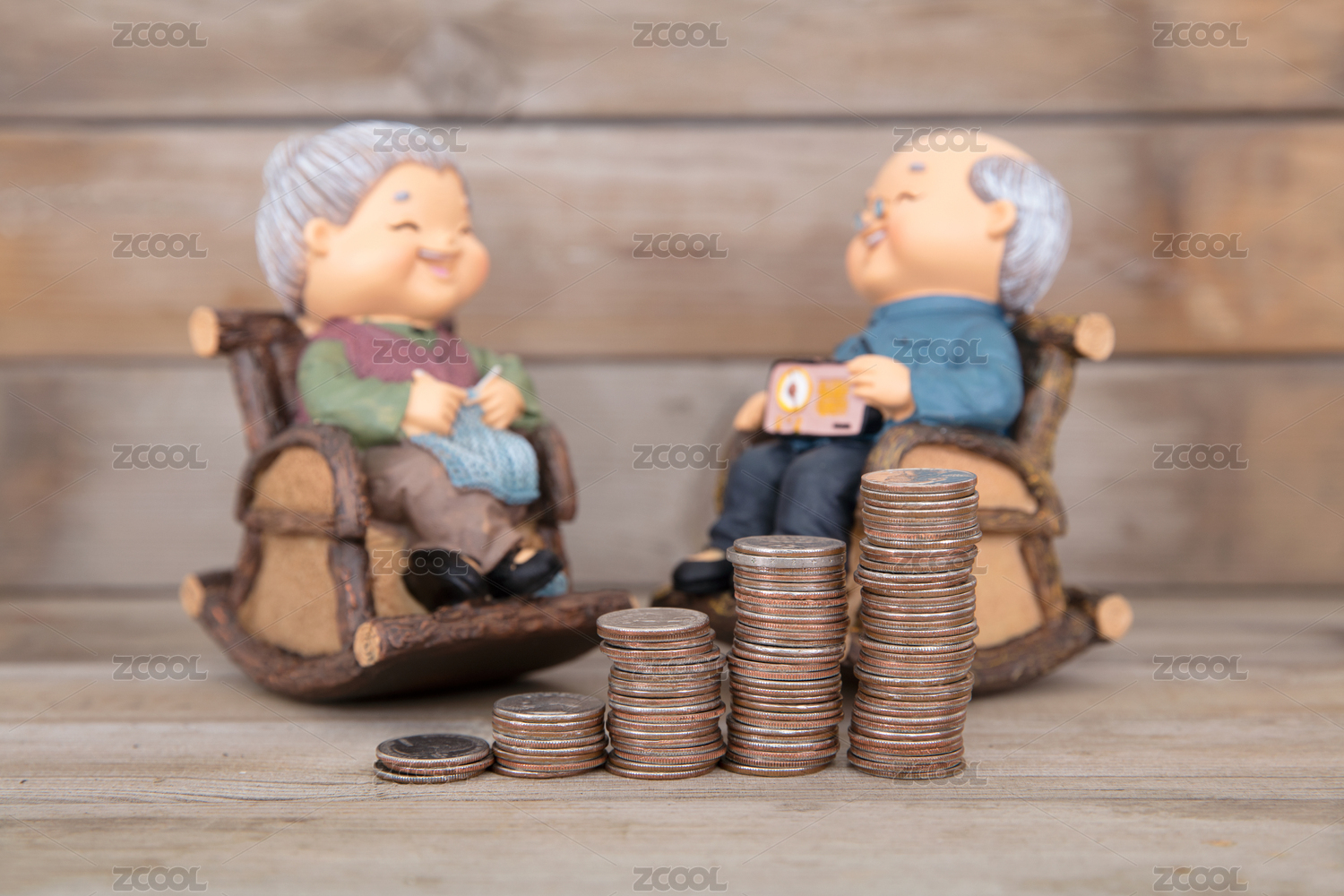 坐着摇椅的老奶奶模型和一排递增的美元硬币