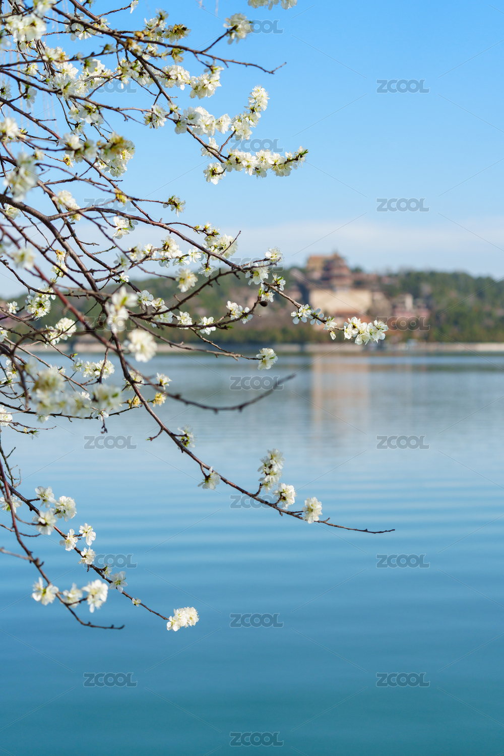颐和园西堤盛开的山桃花与远处的佛香阁