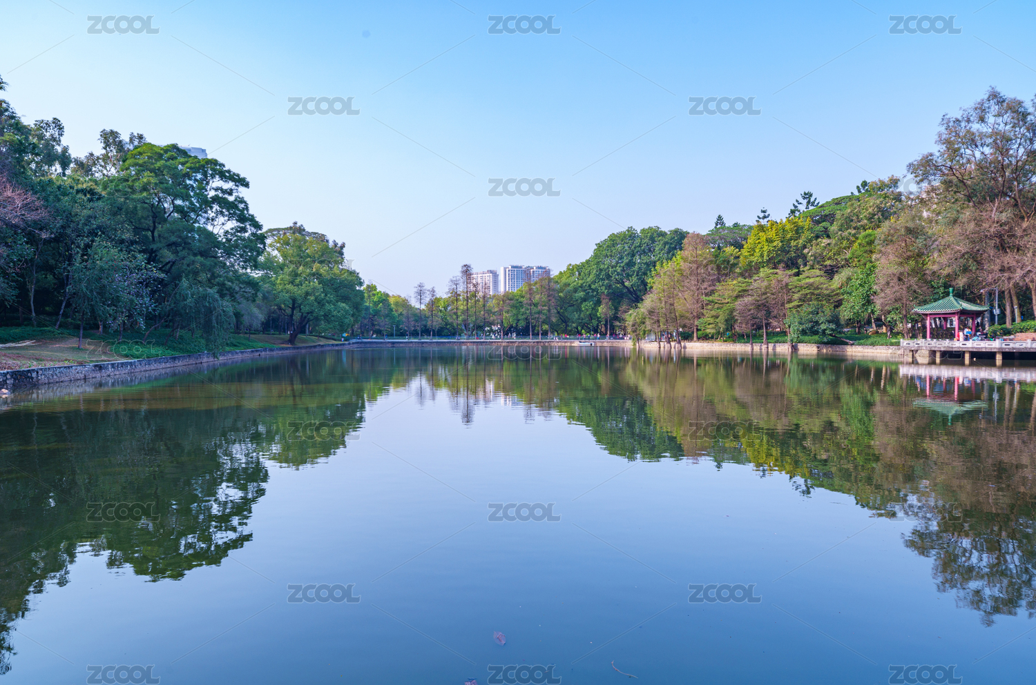 佛山千灯湖公园湖泊树林与城市高楼建筑