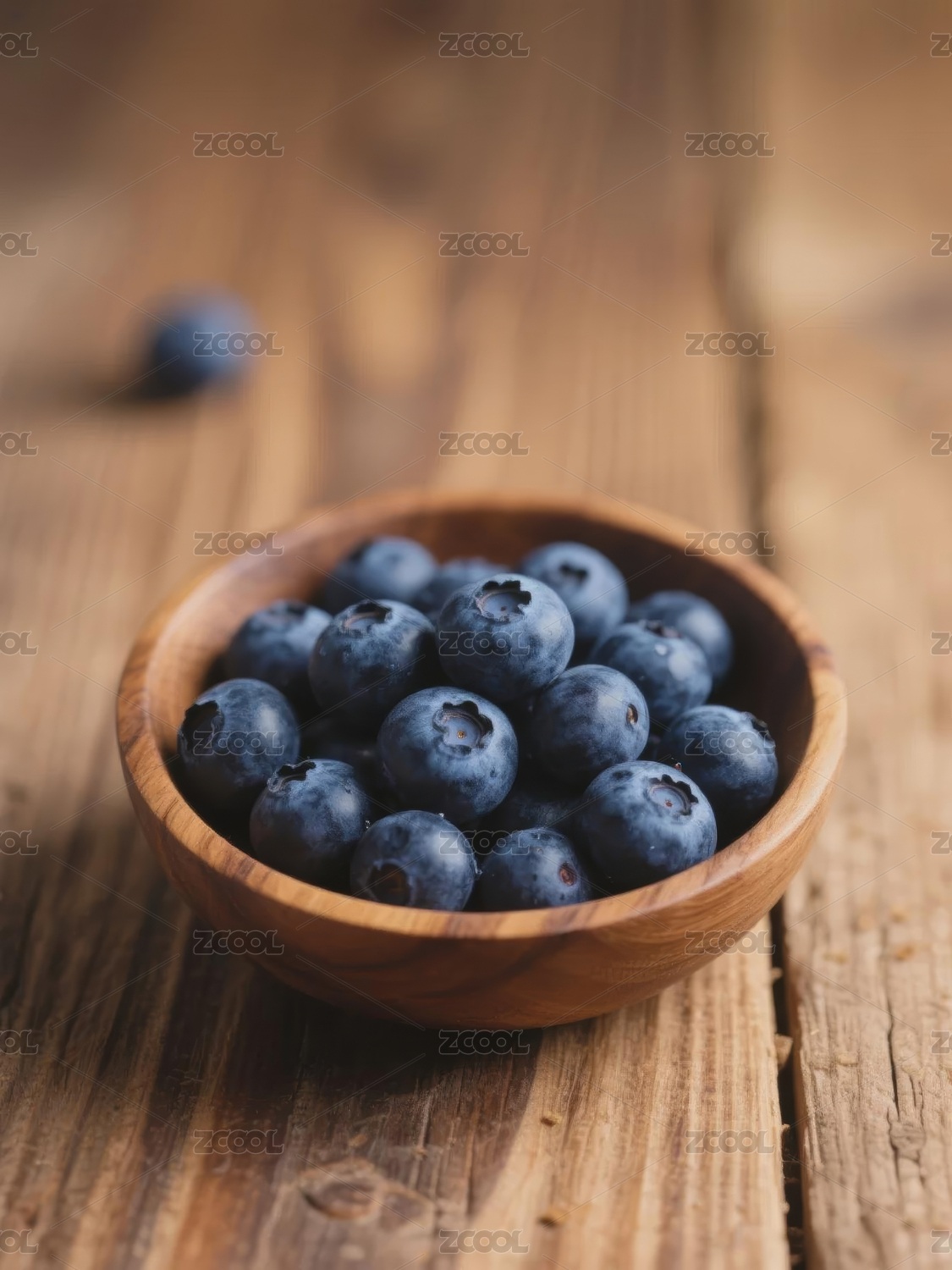 木纹背景中的新鲜蓝莓盛在木勺子里