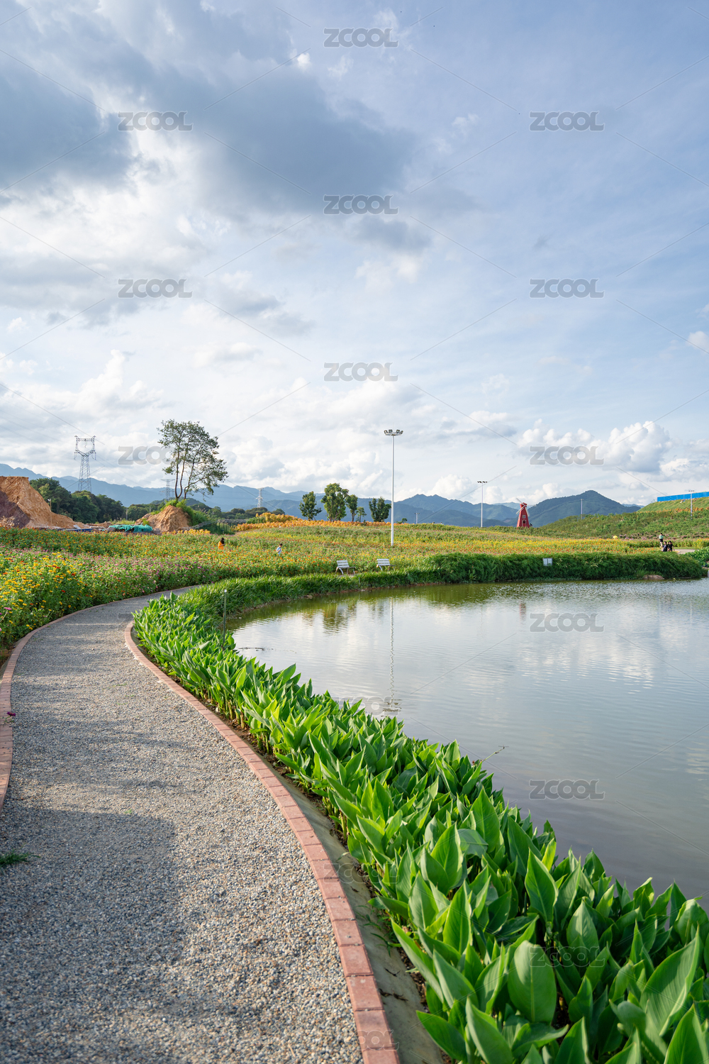 蓝天白云下湖边的沙石小路及绿化的美人蕉