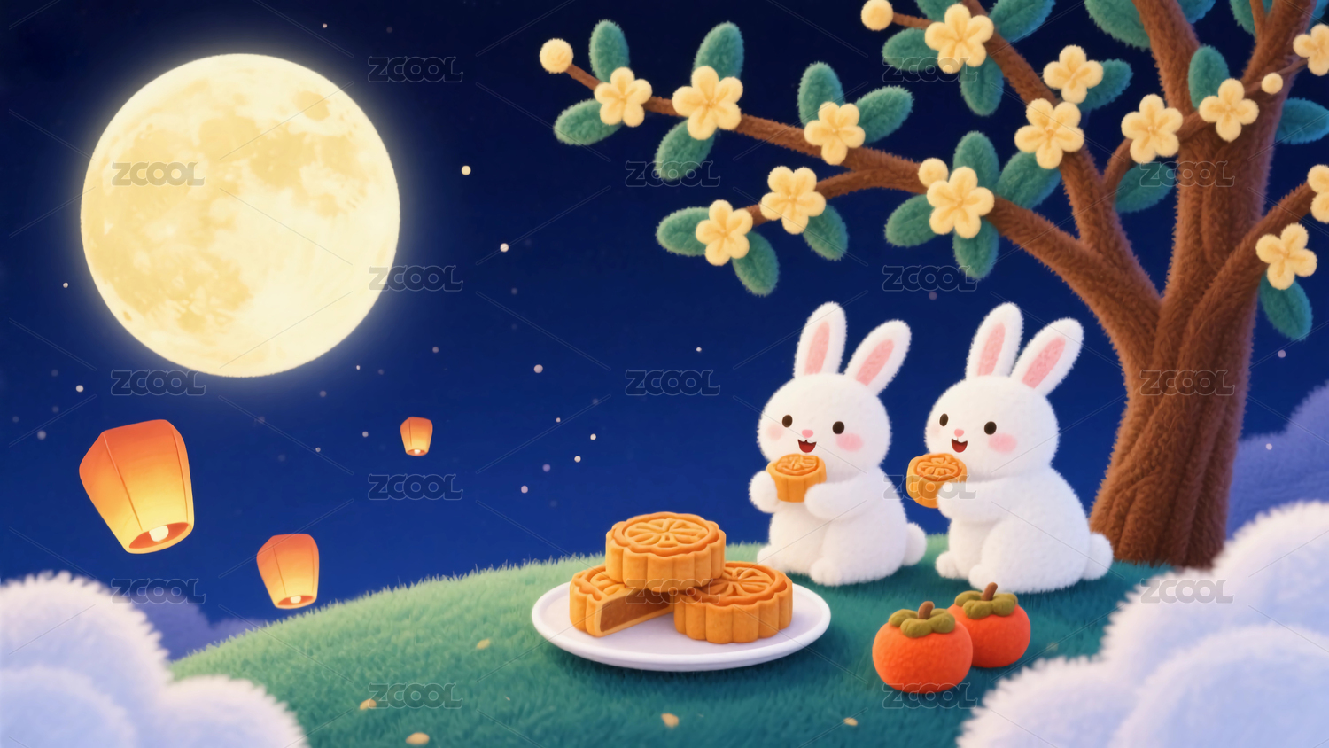 兔子玉兔月饼灯笼花可爱月饼3D立体风格