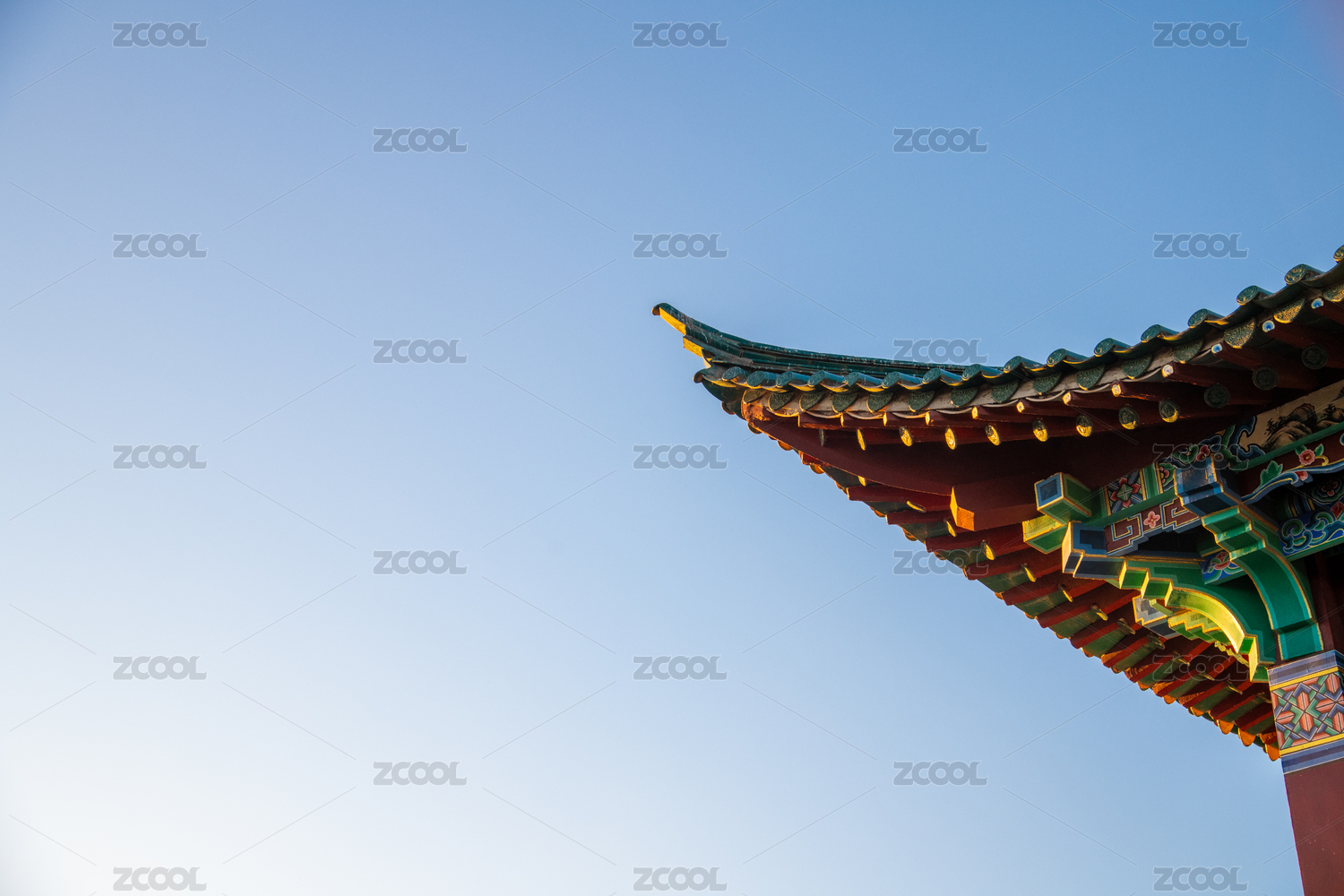 蓝天白云下中国传统古建筑屋角飞檐特写