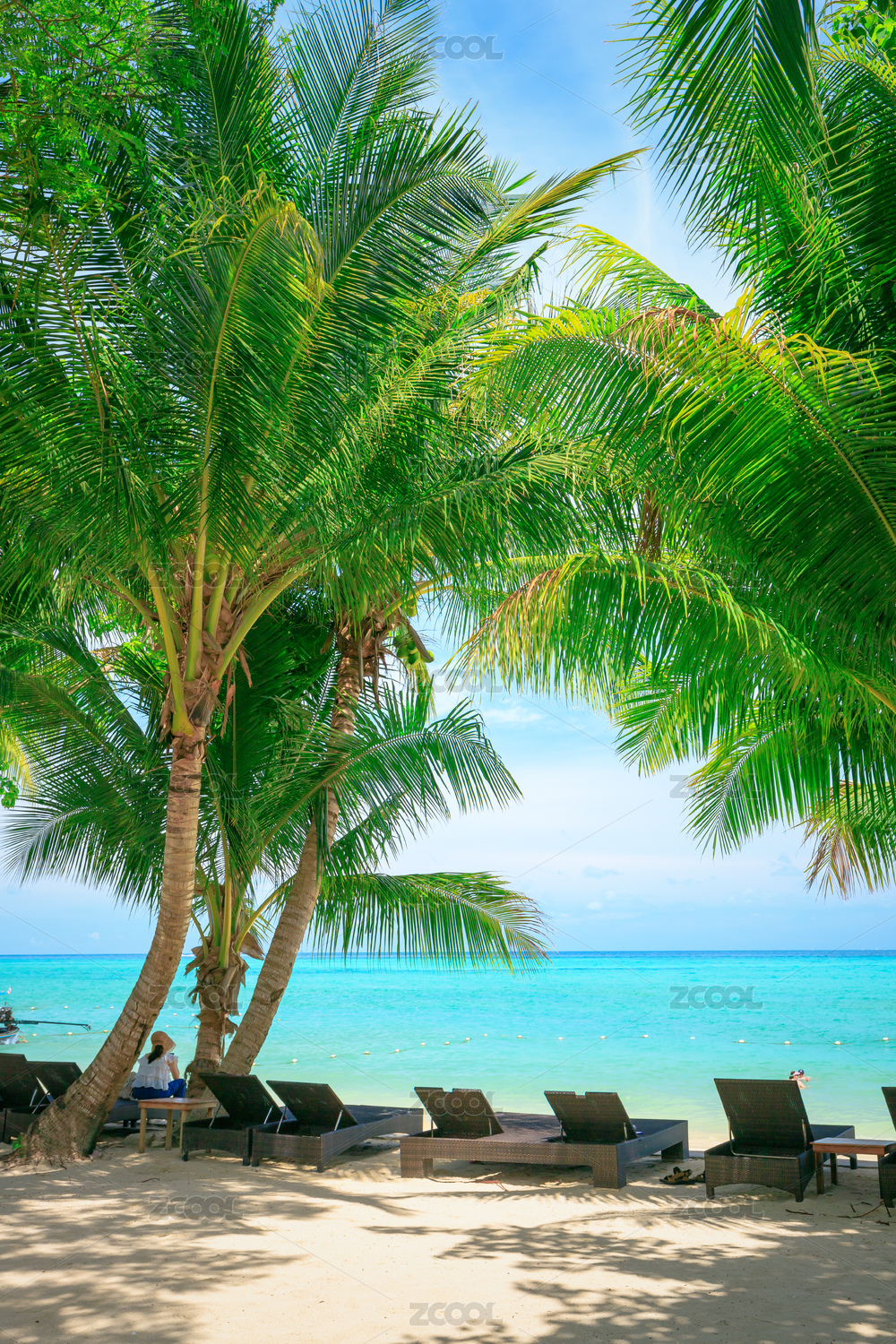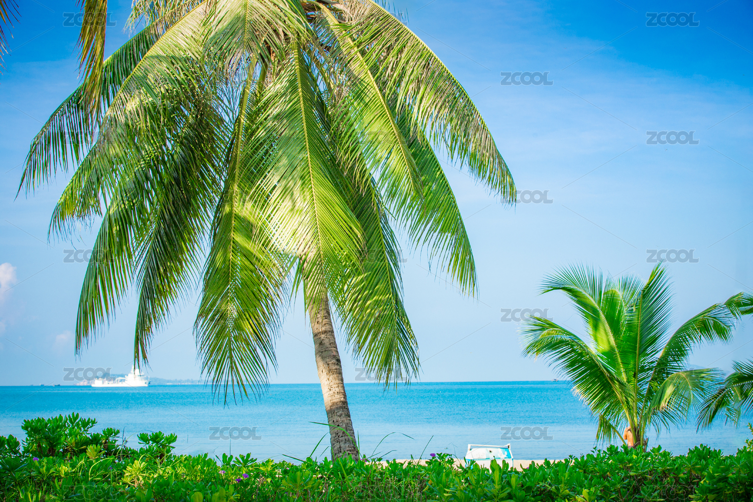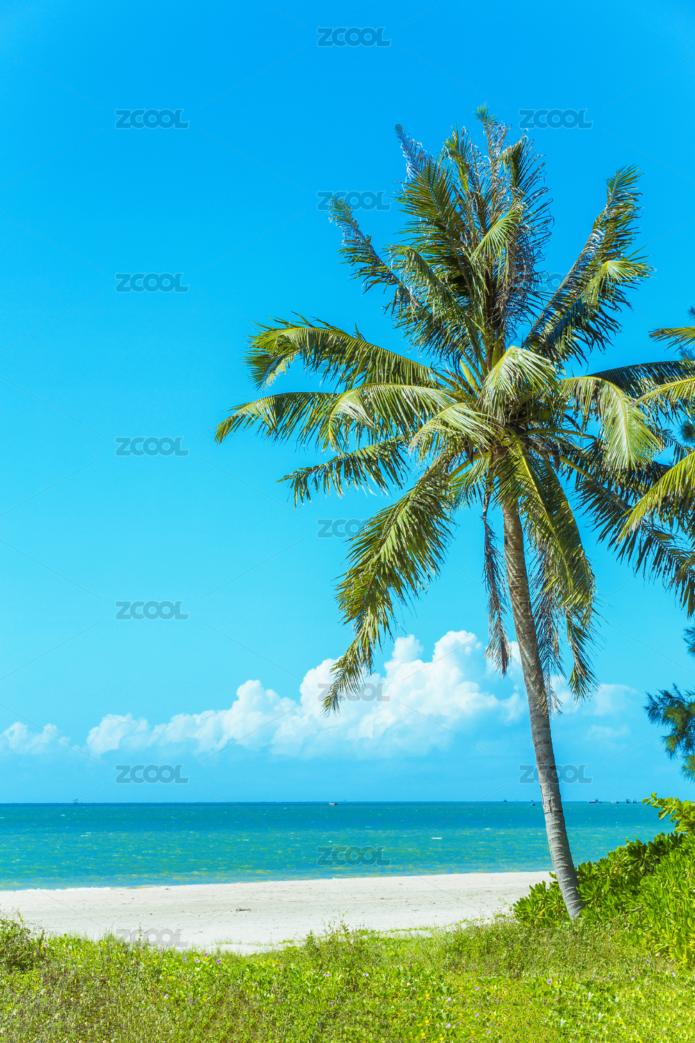 蓝色海水金色海滩绿色椰树