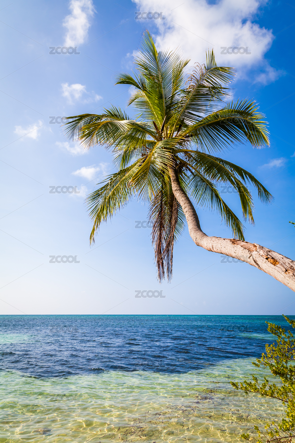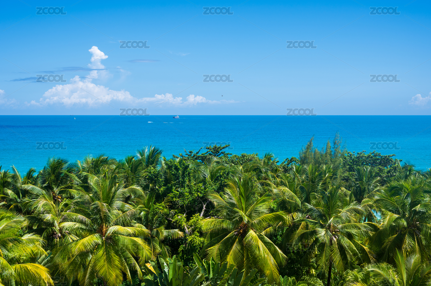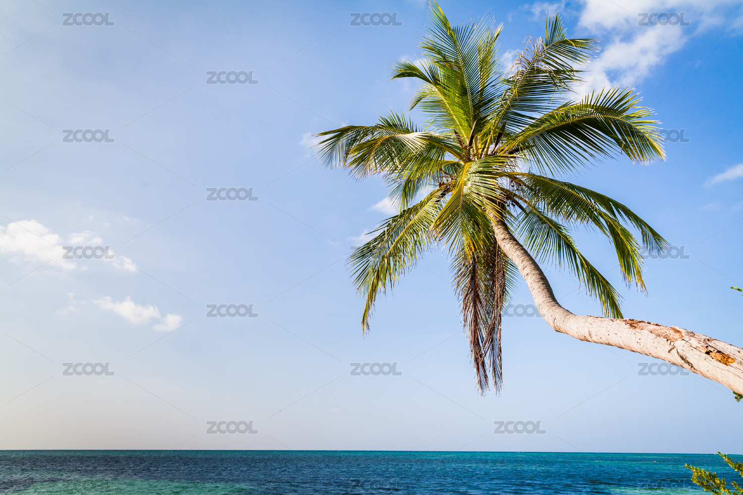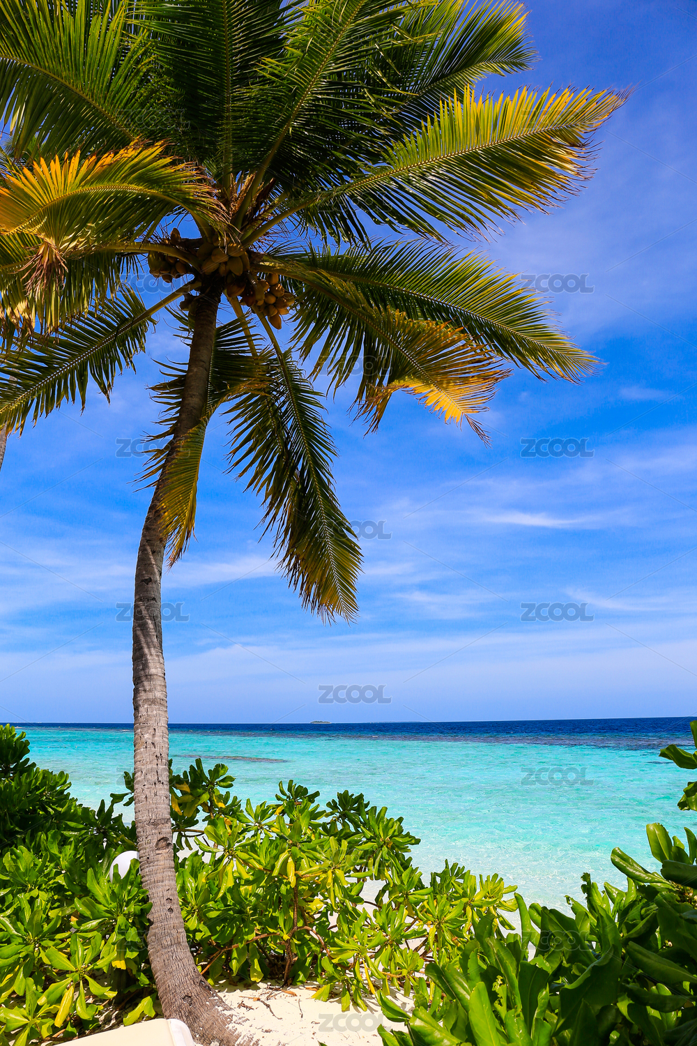 蓝色海水金色海滩绿色椰树