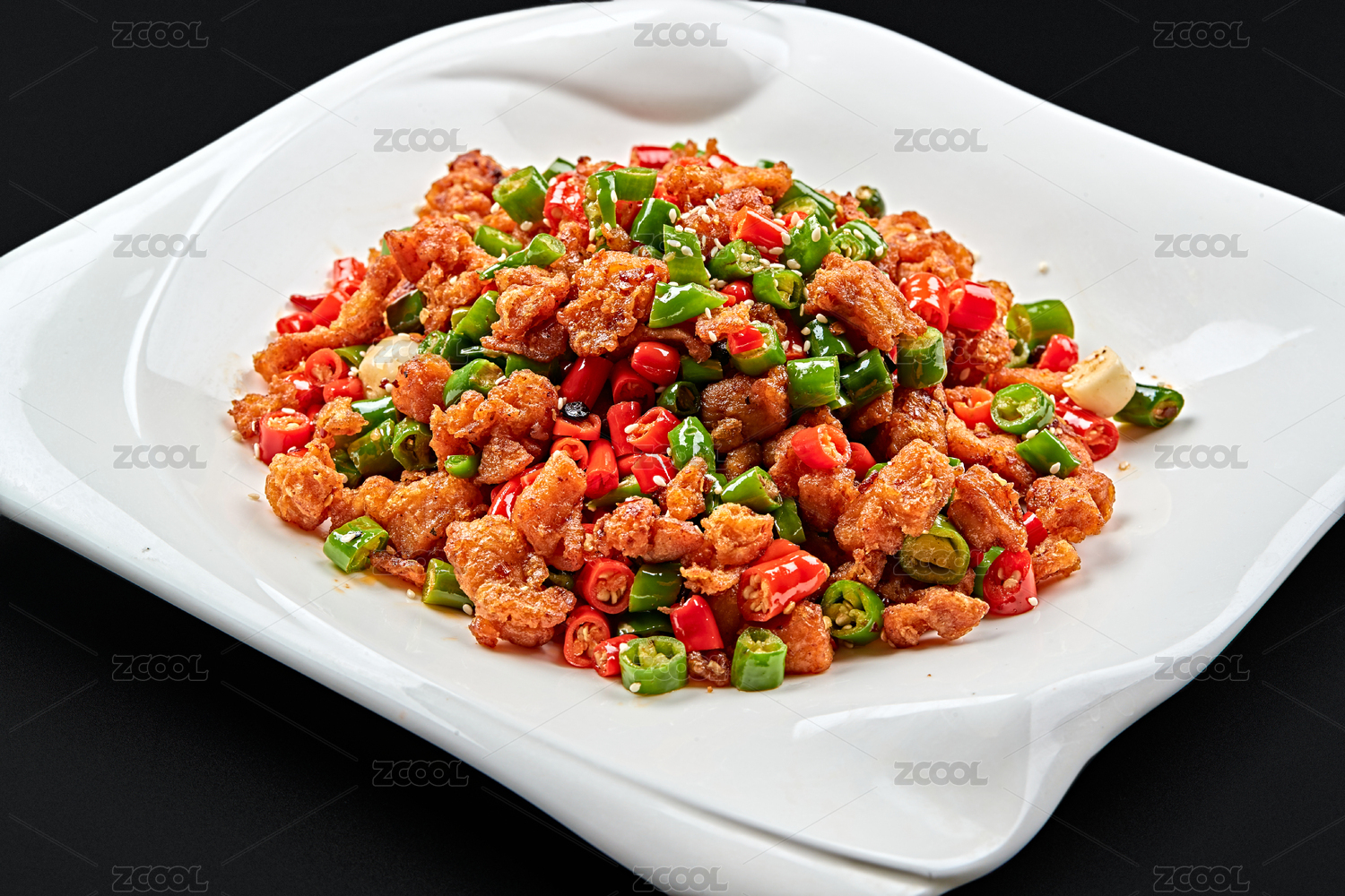 白色瓷盘装的川香口味鲜椒爆鸡丁