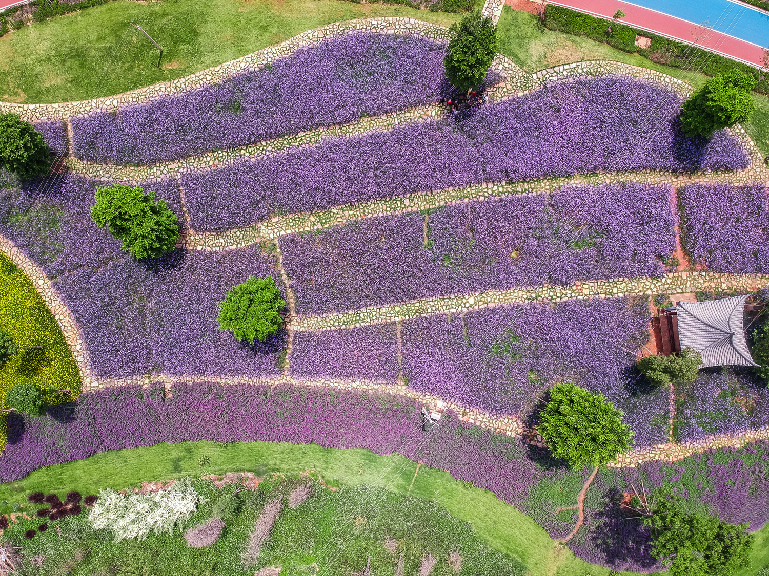 航拍云南省石屏县异龙湖畔的柳叶马鞭草花海