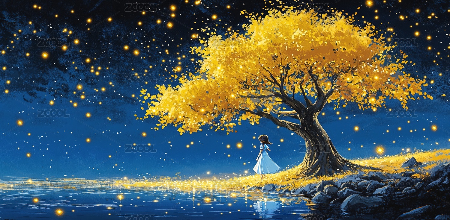 一个小女孩站在夜晚河边的大树下梦幻插画