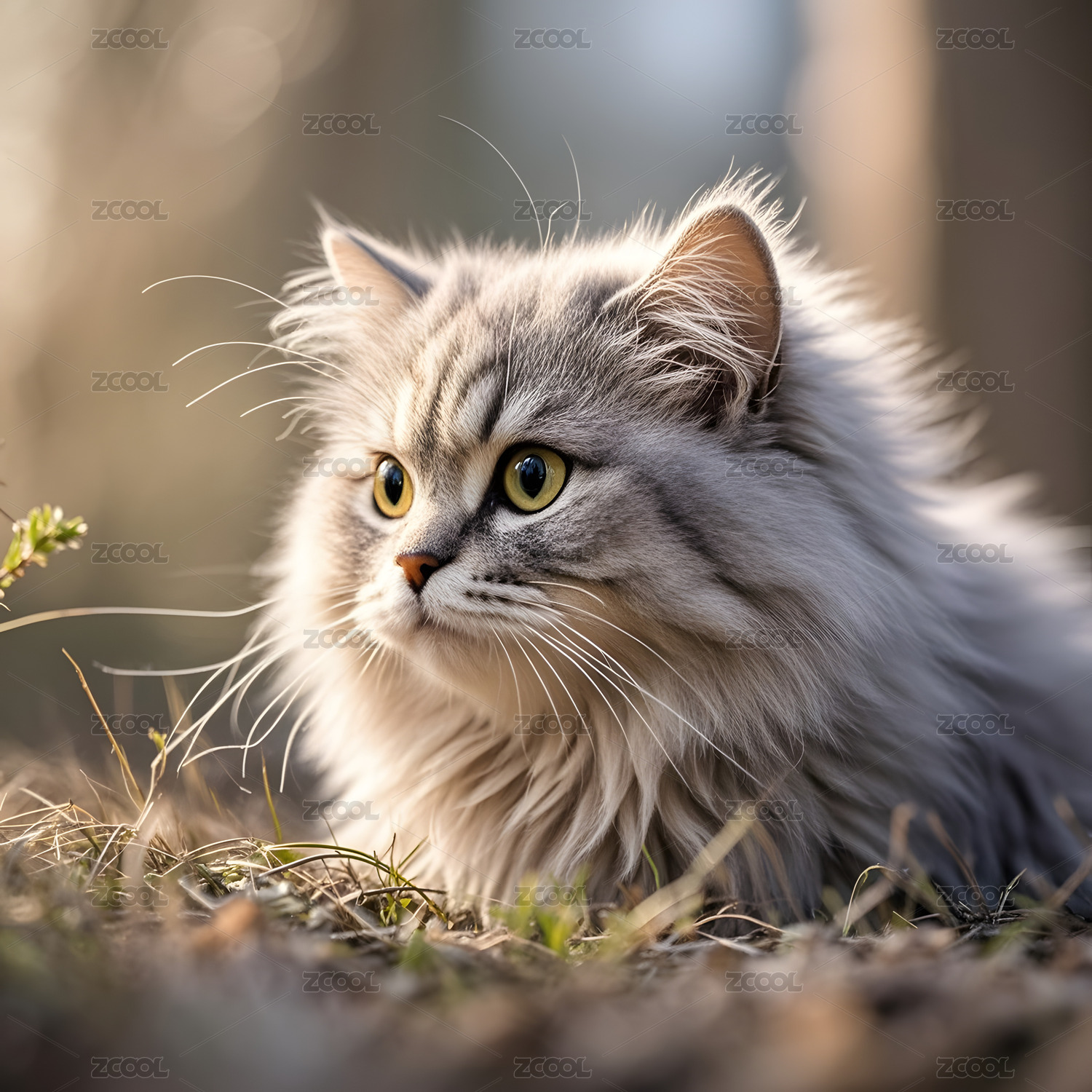 户外草地上的灰色猫咪