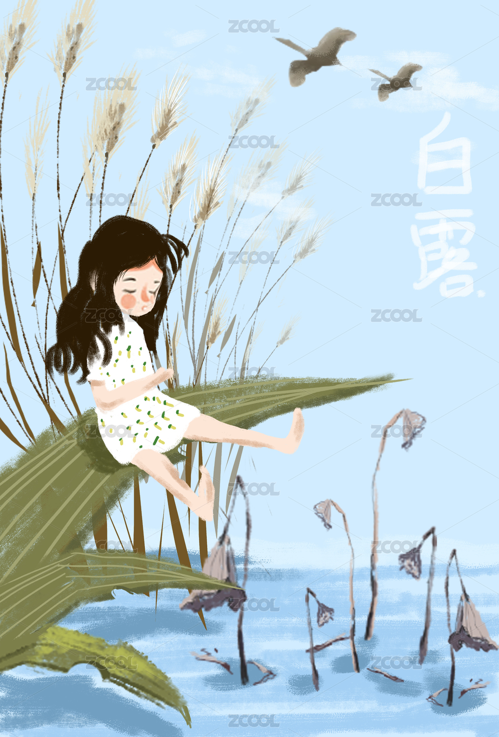 插画处暑女孩河边荷叶节气季节花夕阳小清新