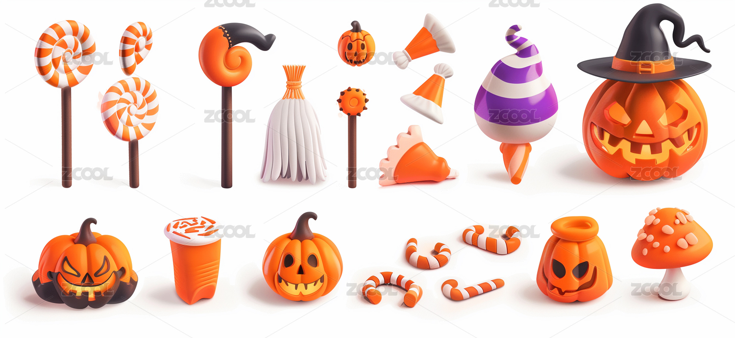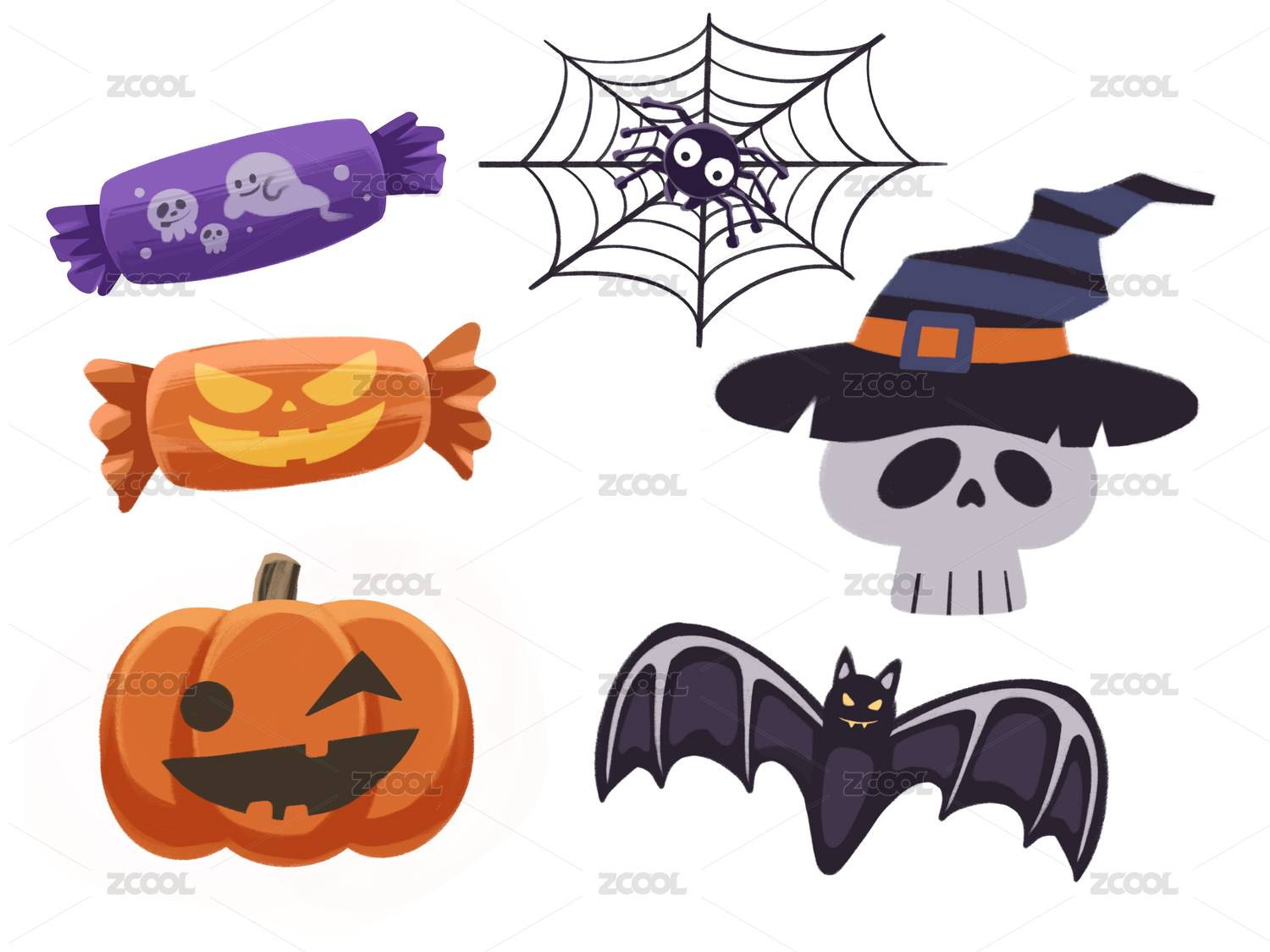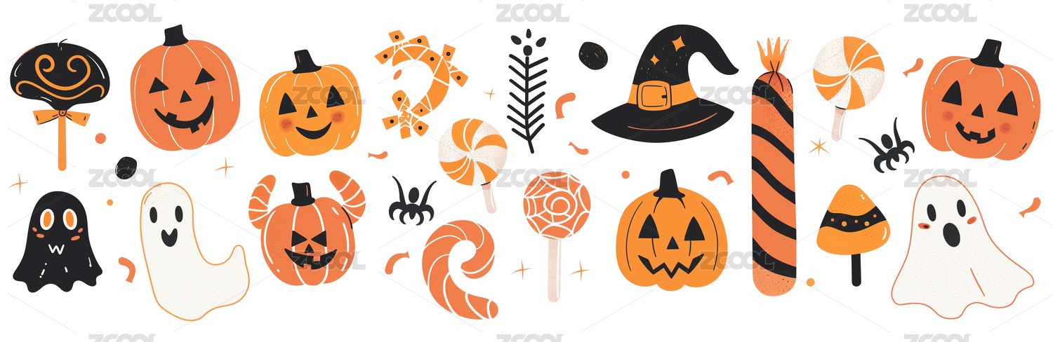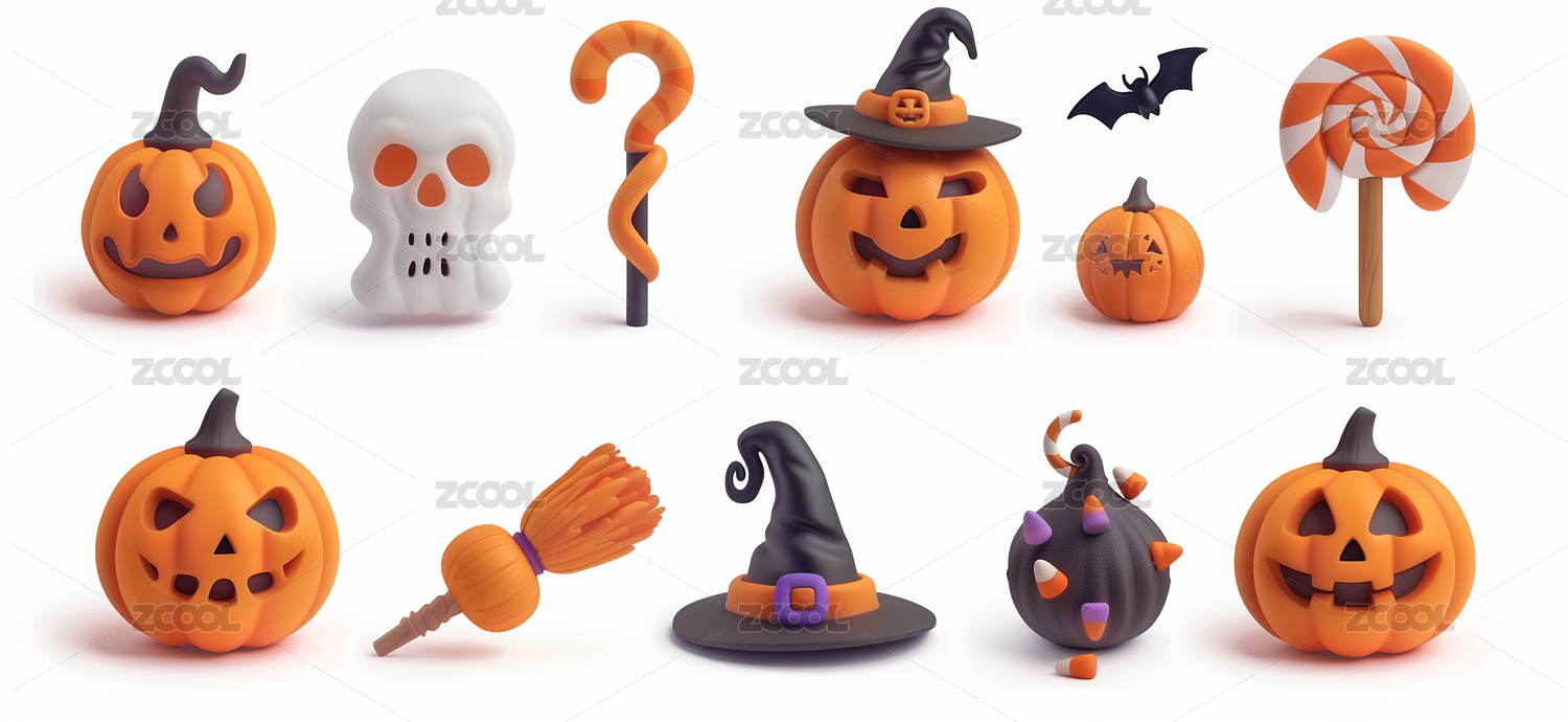 南瓜糖果巫师帽骷髅头蝙蝠蜘蛛万圣节组合