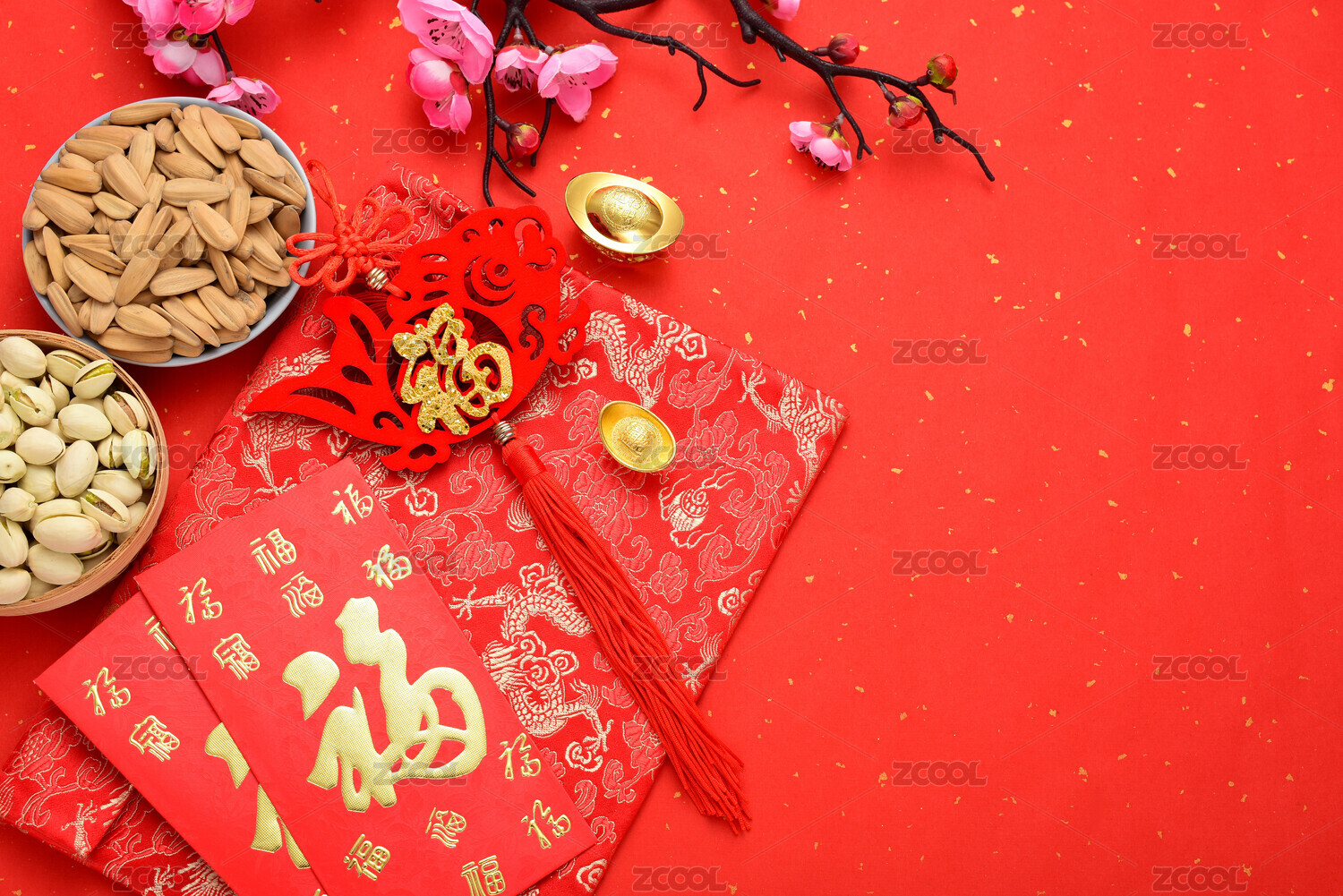 红色背景上的红包、元宝、中国结、红枣和花生瓜子坚果