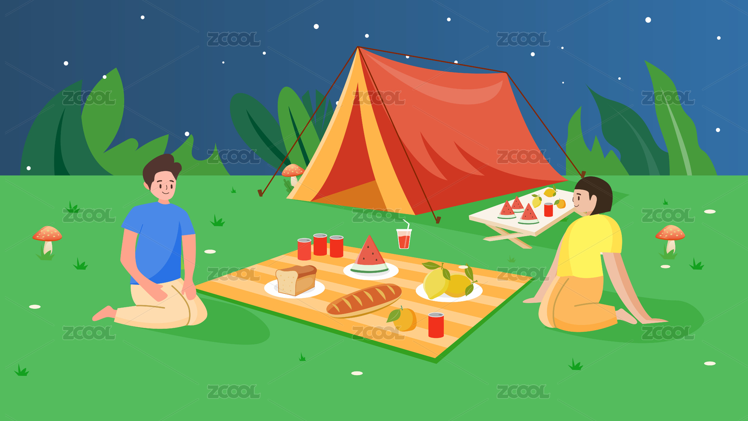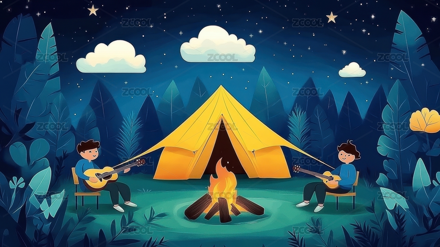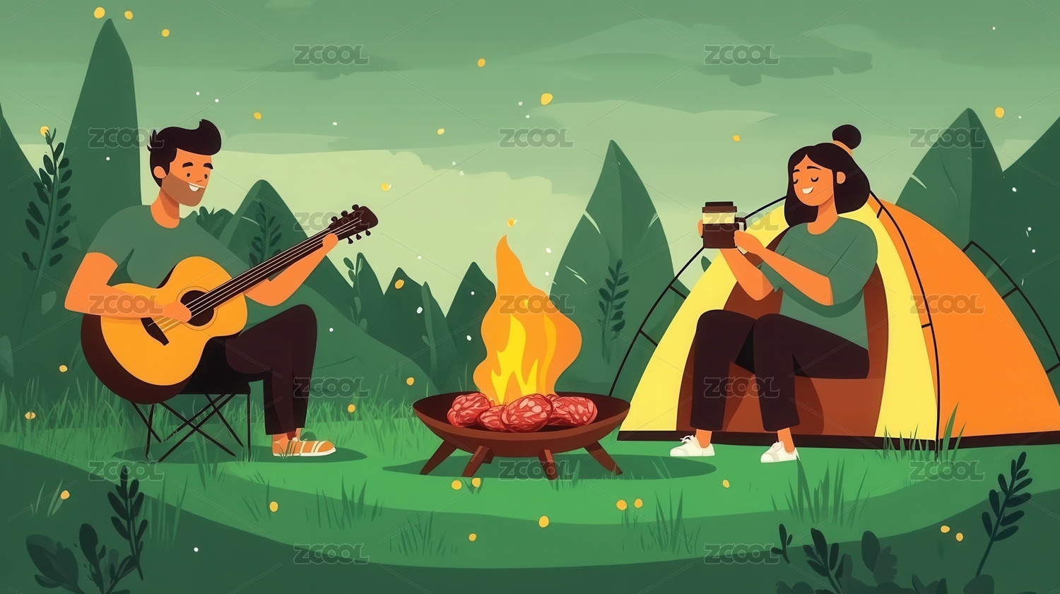户外帐篷露营情侣弹吉他插画