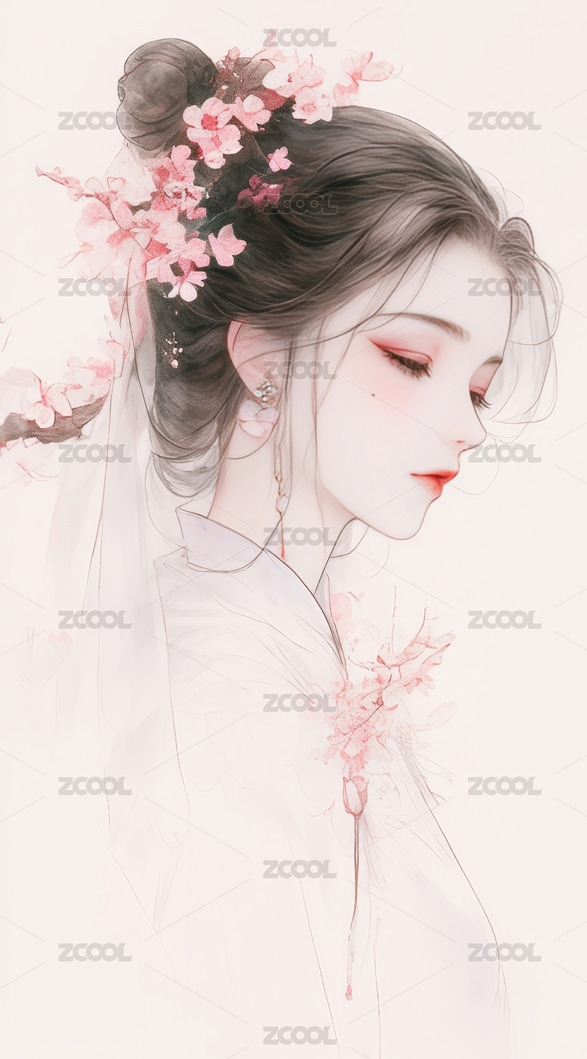 水墨风,女孩,女生,美女,侧面视角,半身像,植物,对视,竖构图,古风