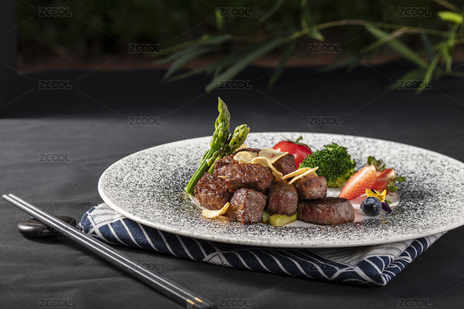 黑胡椒煎杏鲍菇牛仔骨摆放在寿司帘上