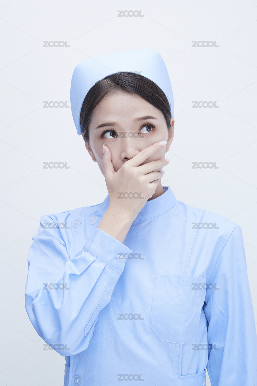 身穿蓝色护士服展示各种表情的漂亮女护士