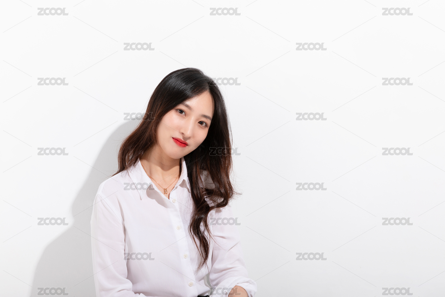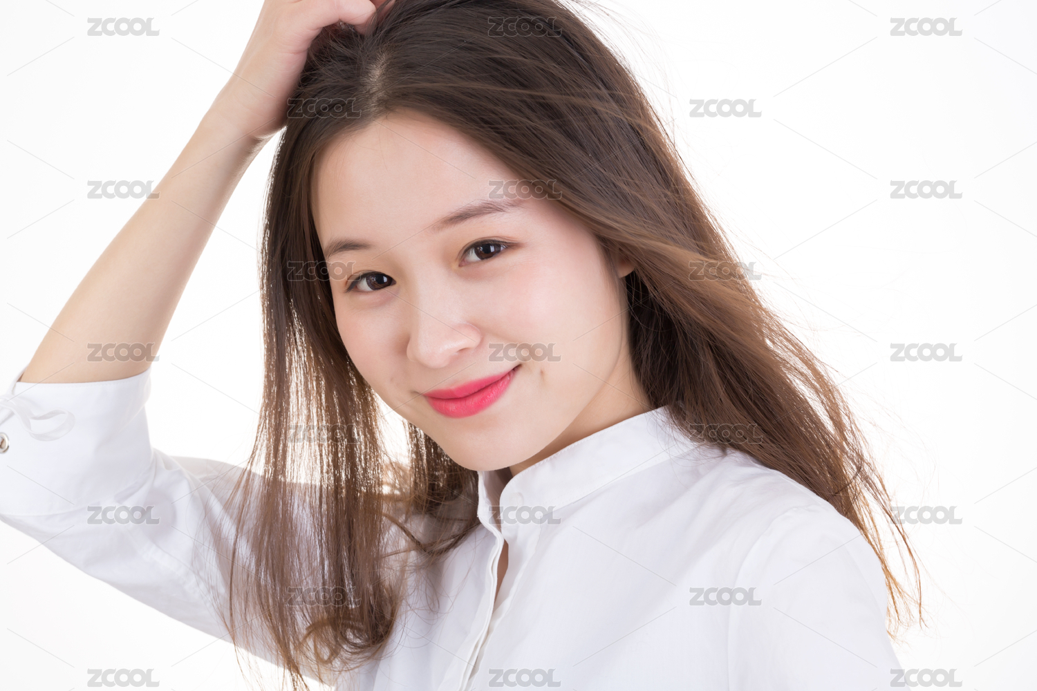 身穿白色衬衣的年轻美丽女性在抚弄自己的头发