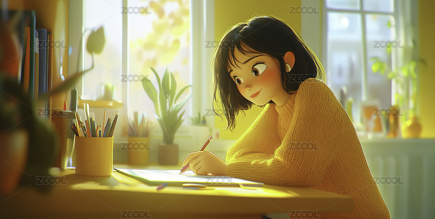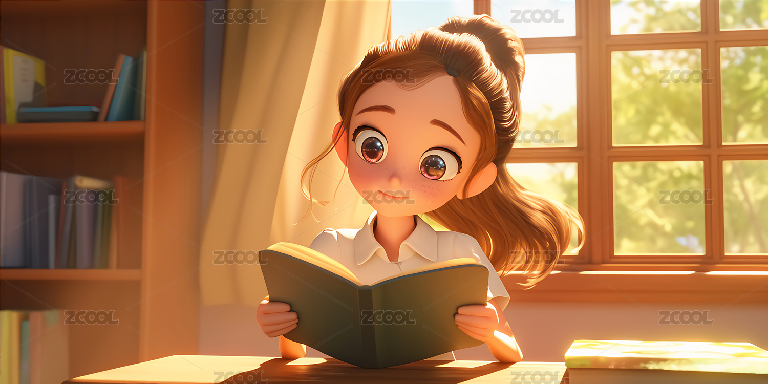 室内窗旁书桌前看书的女性3D卡通立体插画