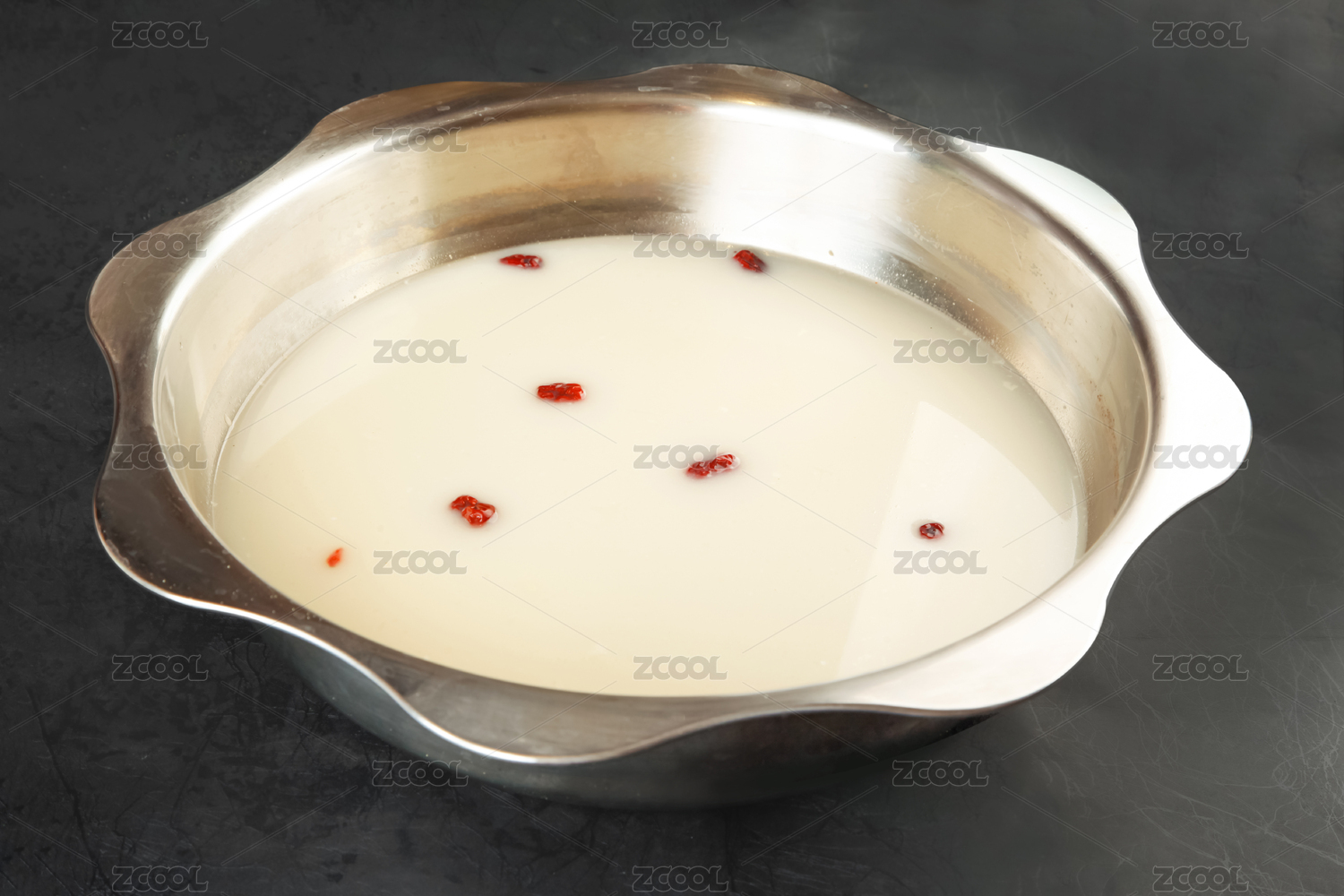 一锅金黄色冒着热气的汤,上面飘着番茄蘑菇,旁边配着蔬菜