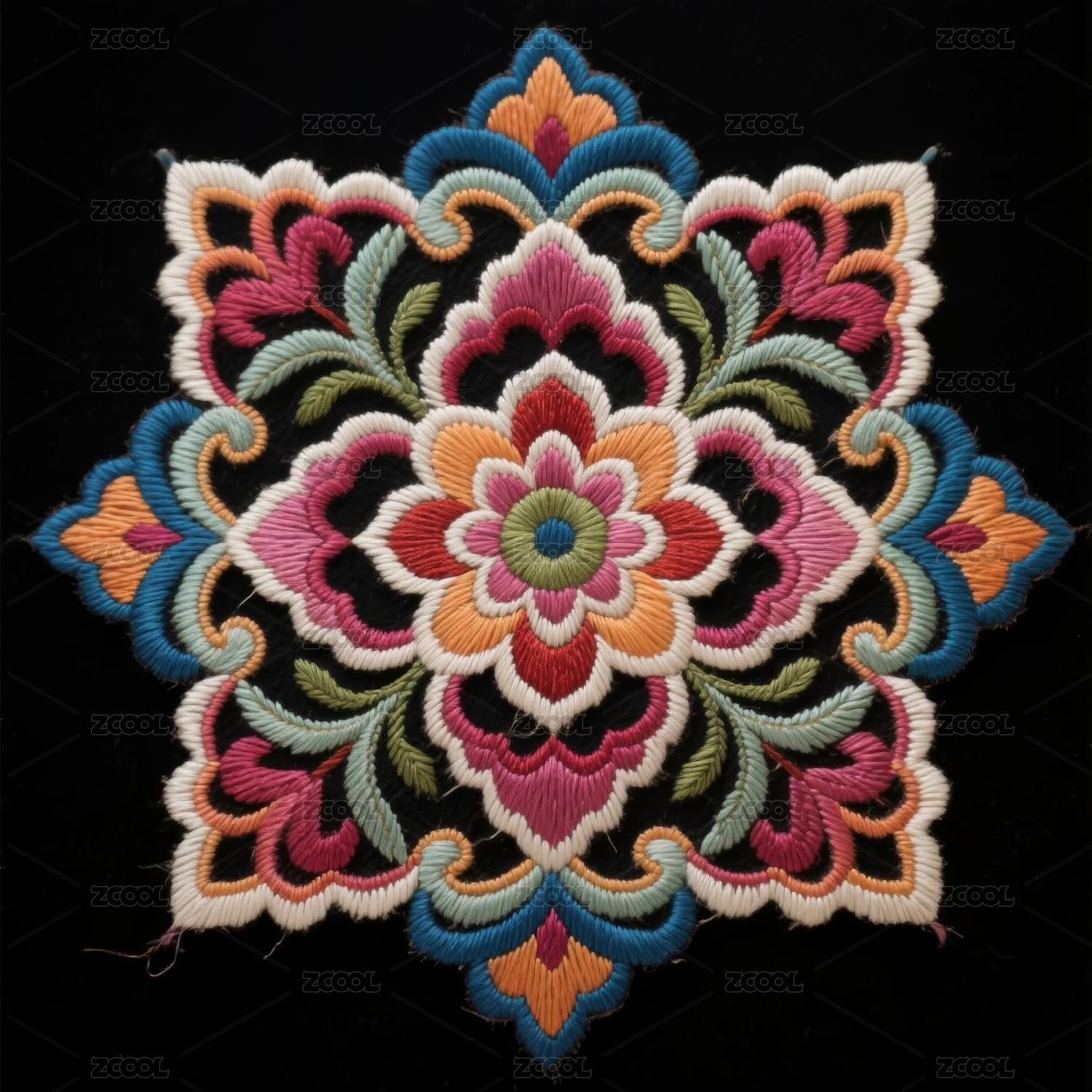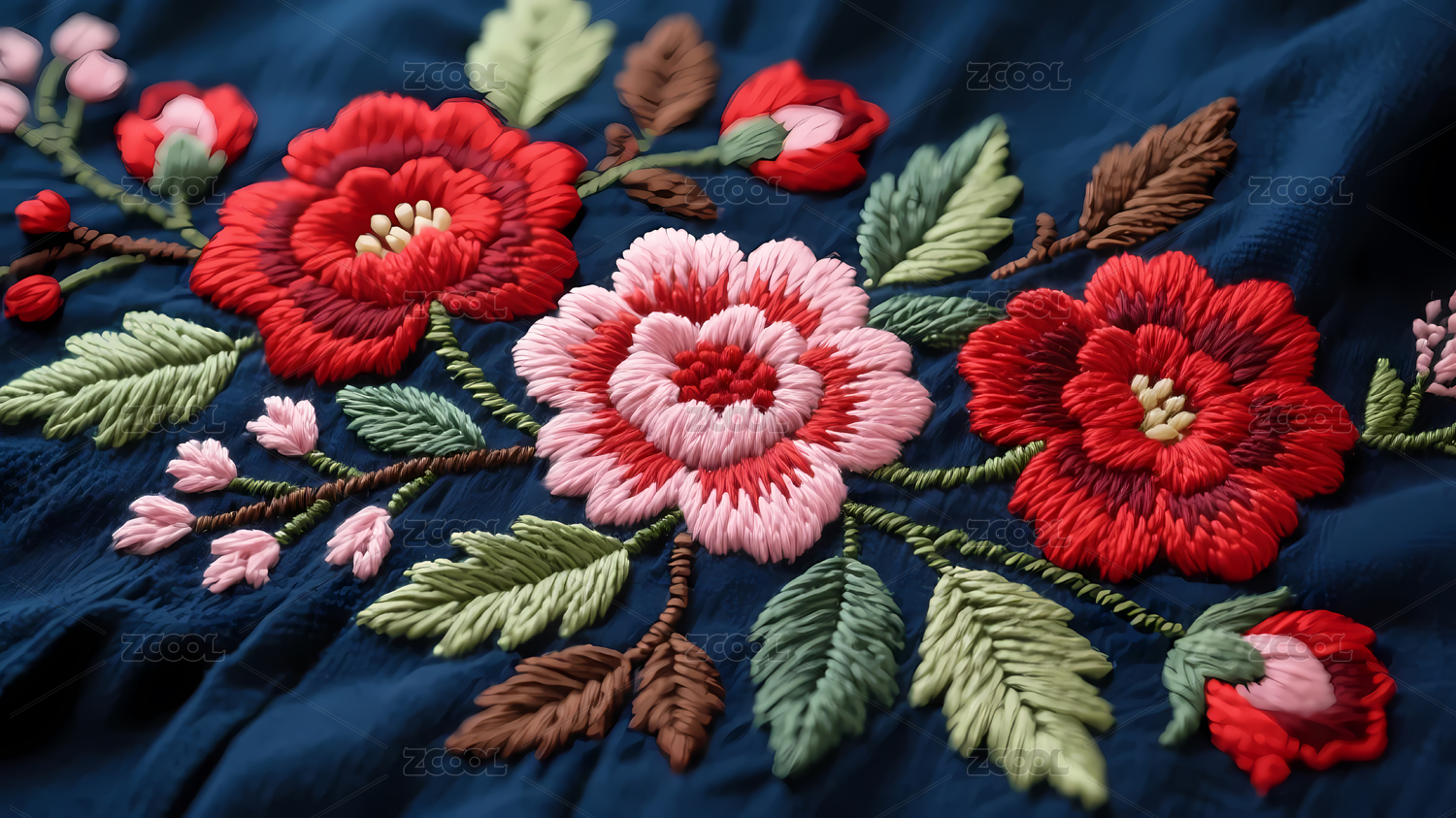 深蓝布料上的花朵刺绣