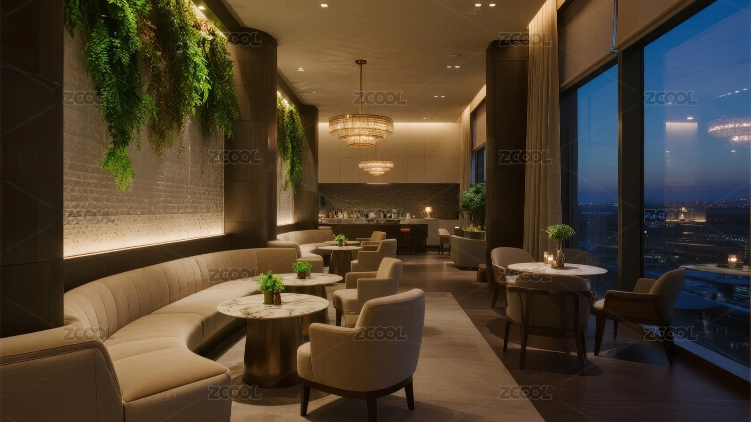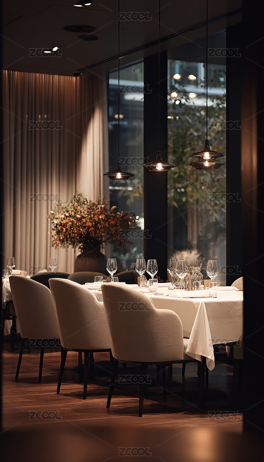 现代餐厅夜景,窗外城市灯火辉煌