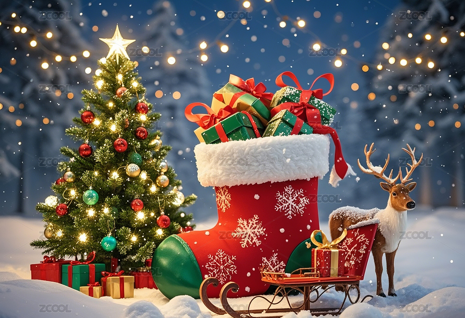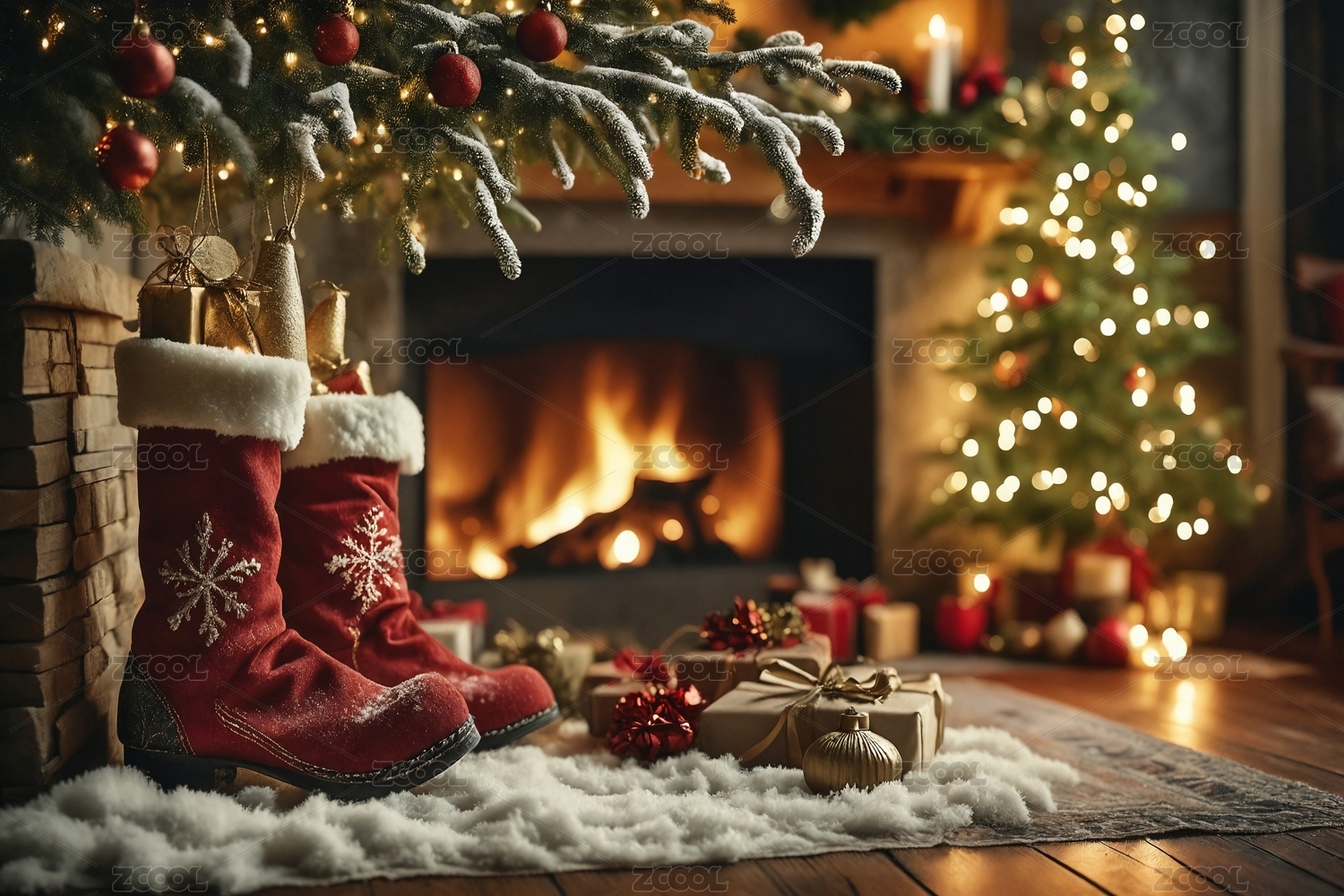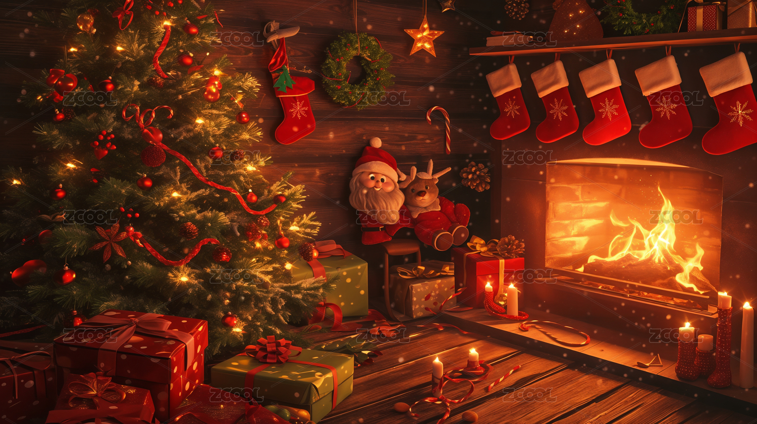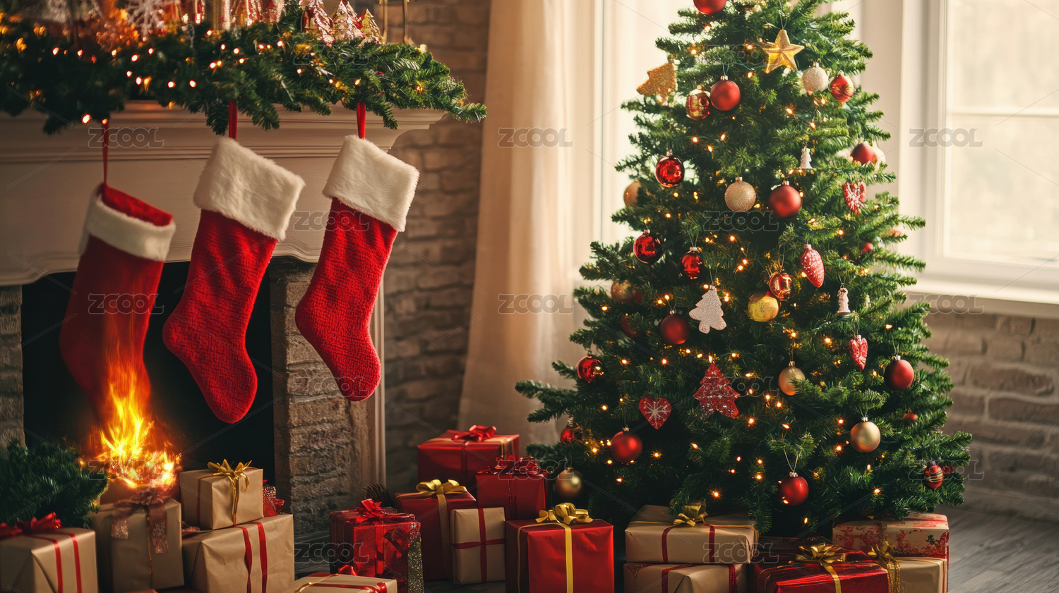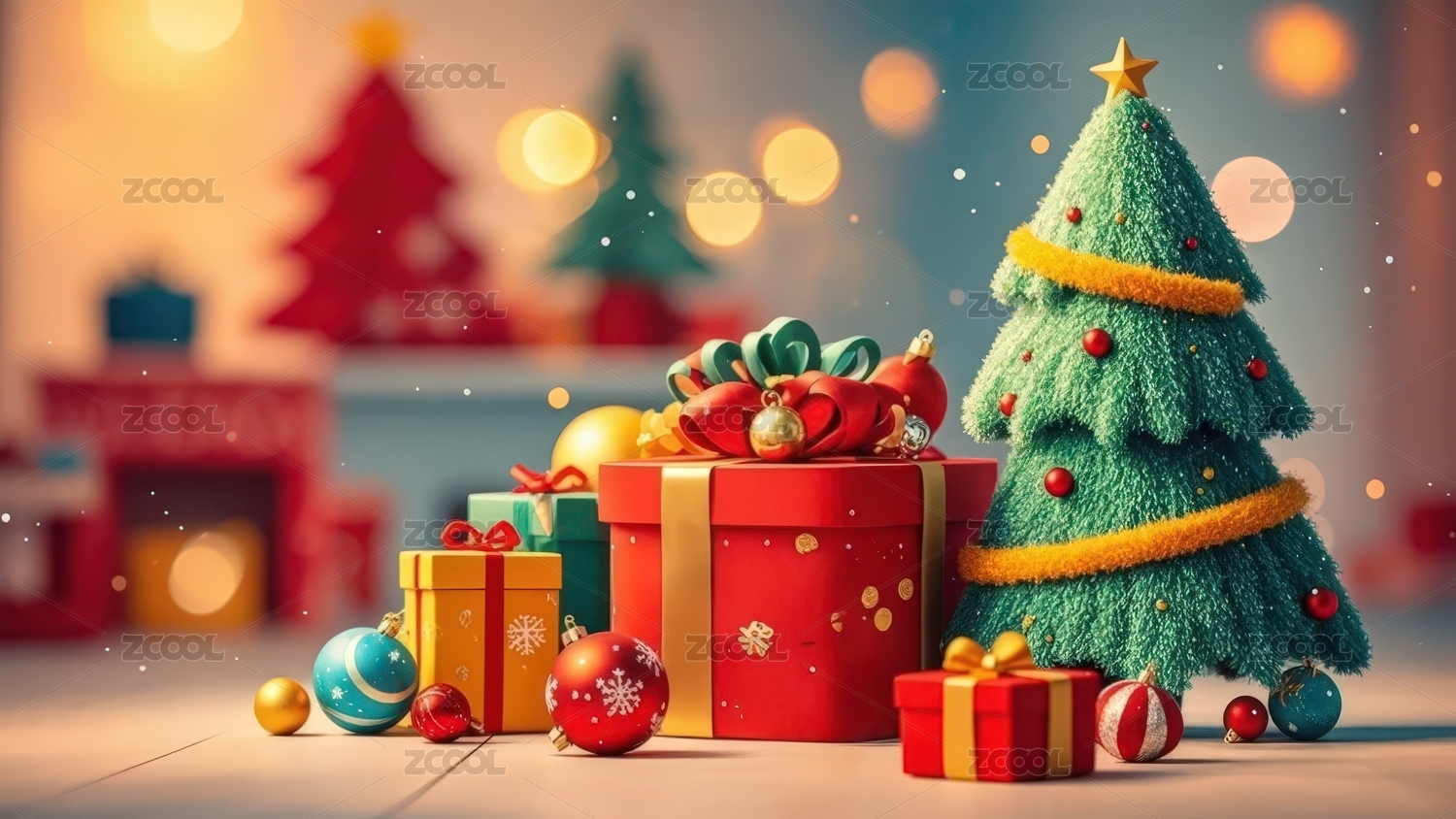室内圣诞树和漂亮的圣诞礼物装饰圣诞节日