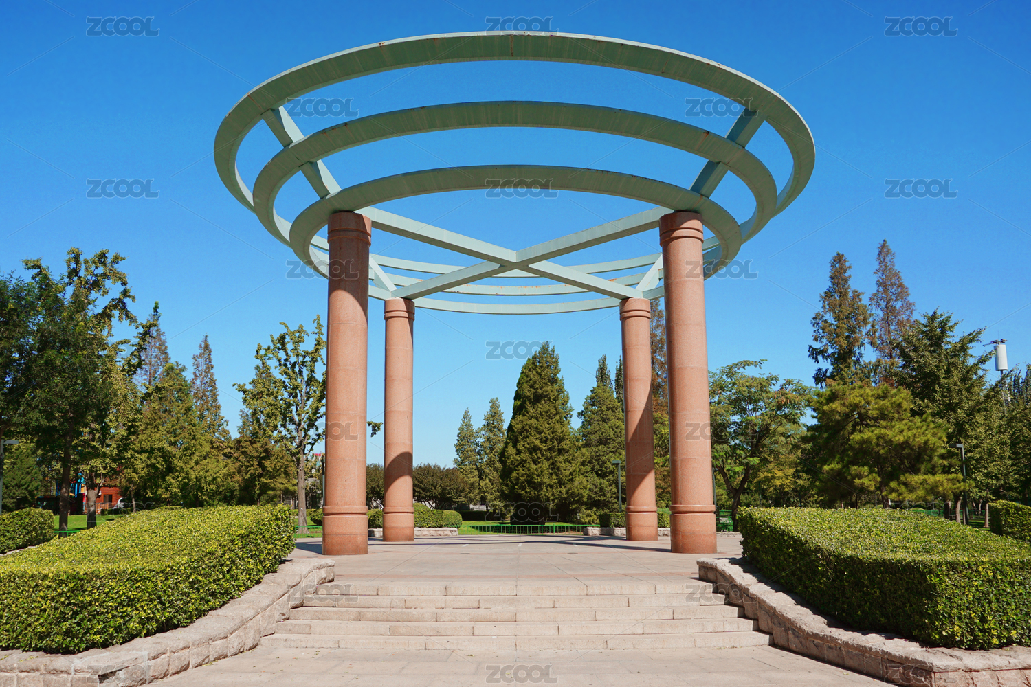 蓝天白云下中国北京圆明园荷塘栈道和亭子
