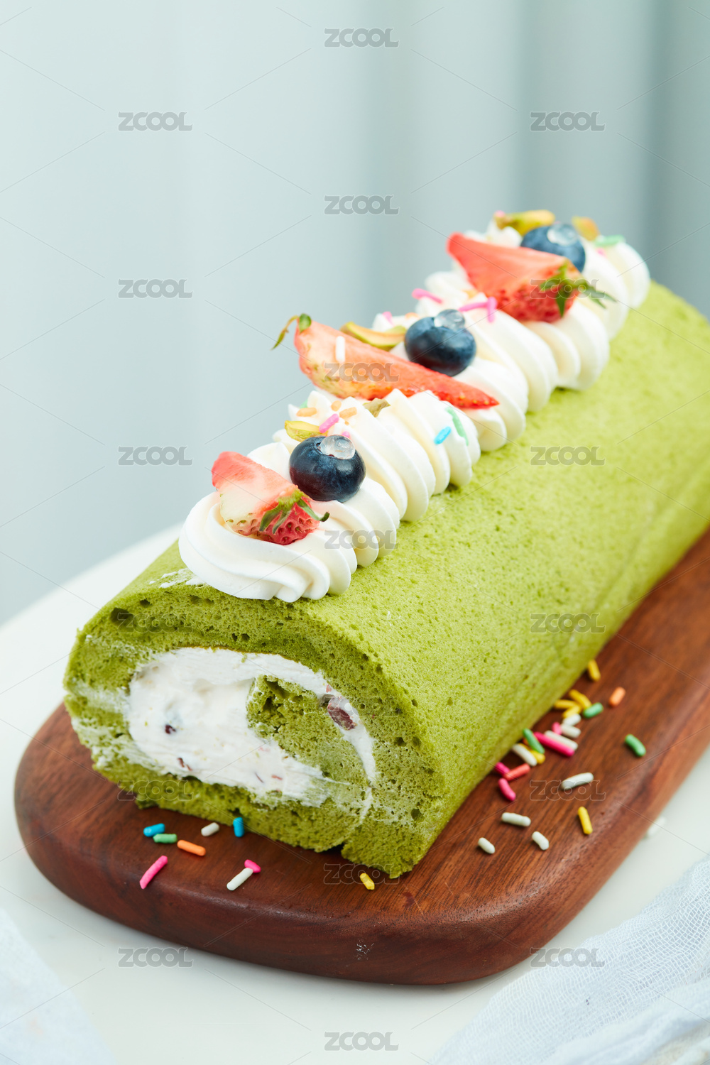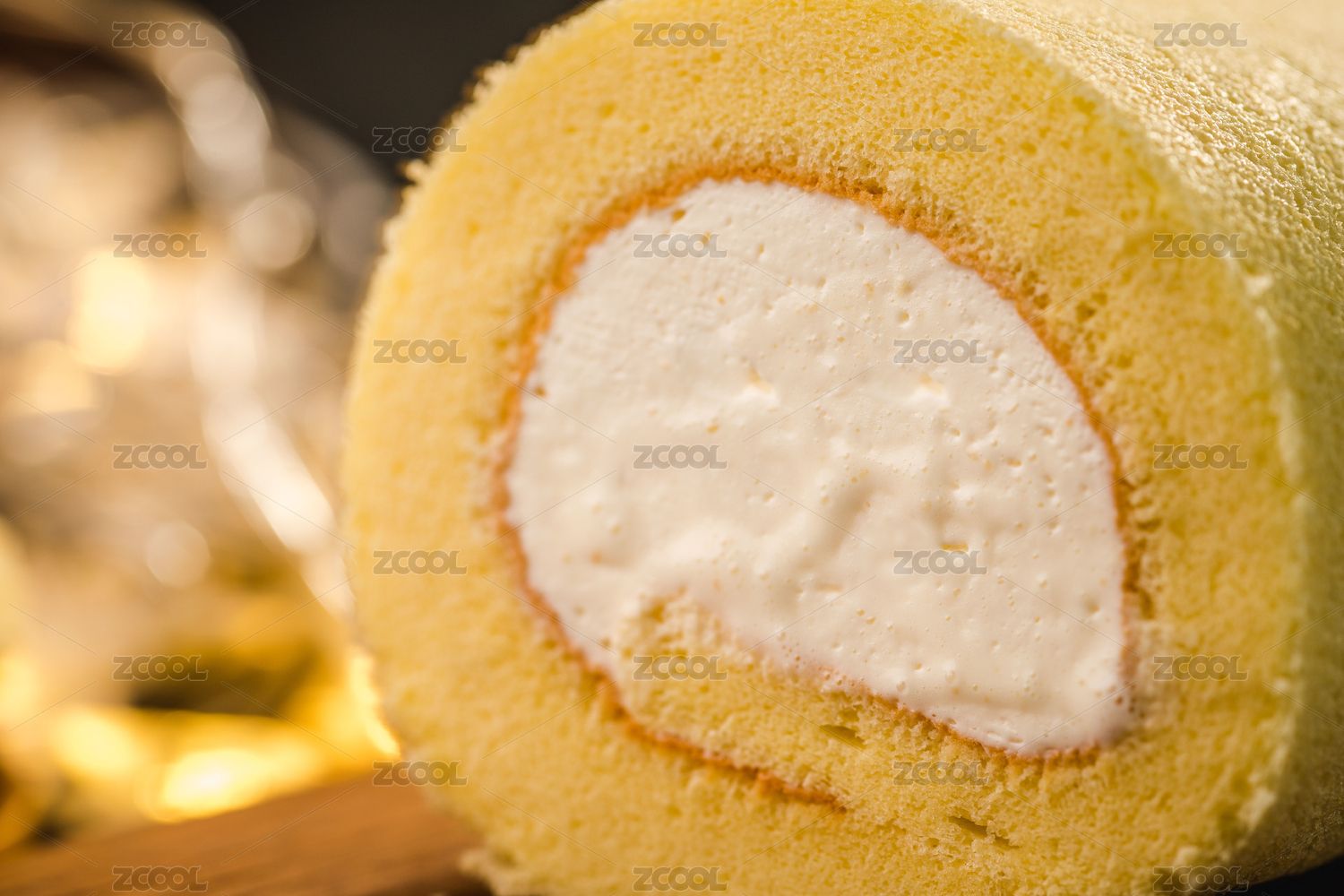 棕色桌面上放着一份奶油夹心蛋糕卷