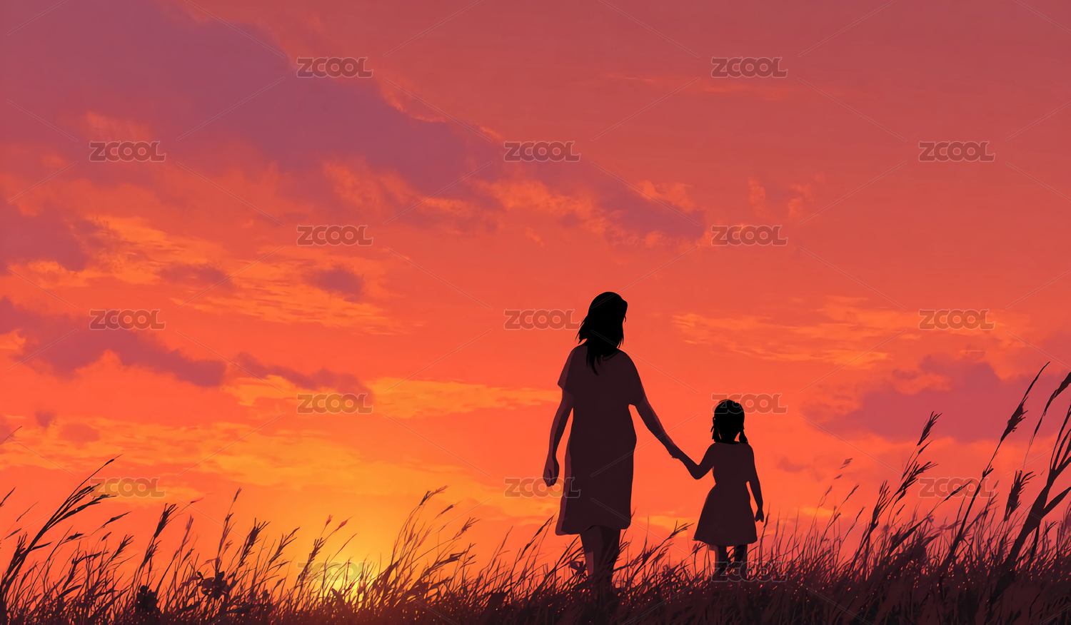 母亲,孩子,日落,自然,宁静,美丽,保护,和谐,亲子,亲情