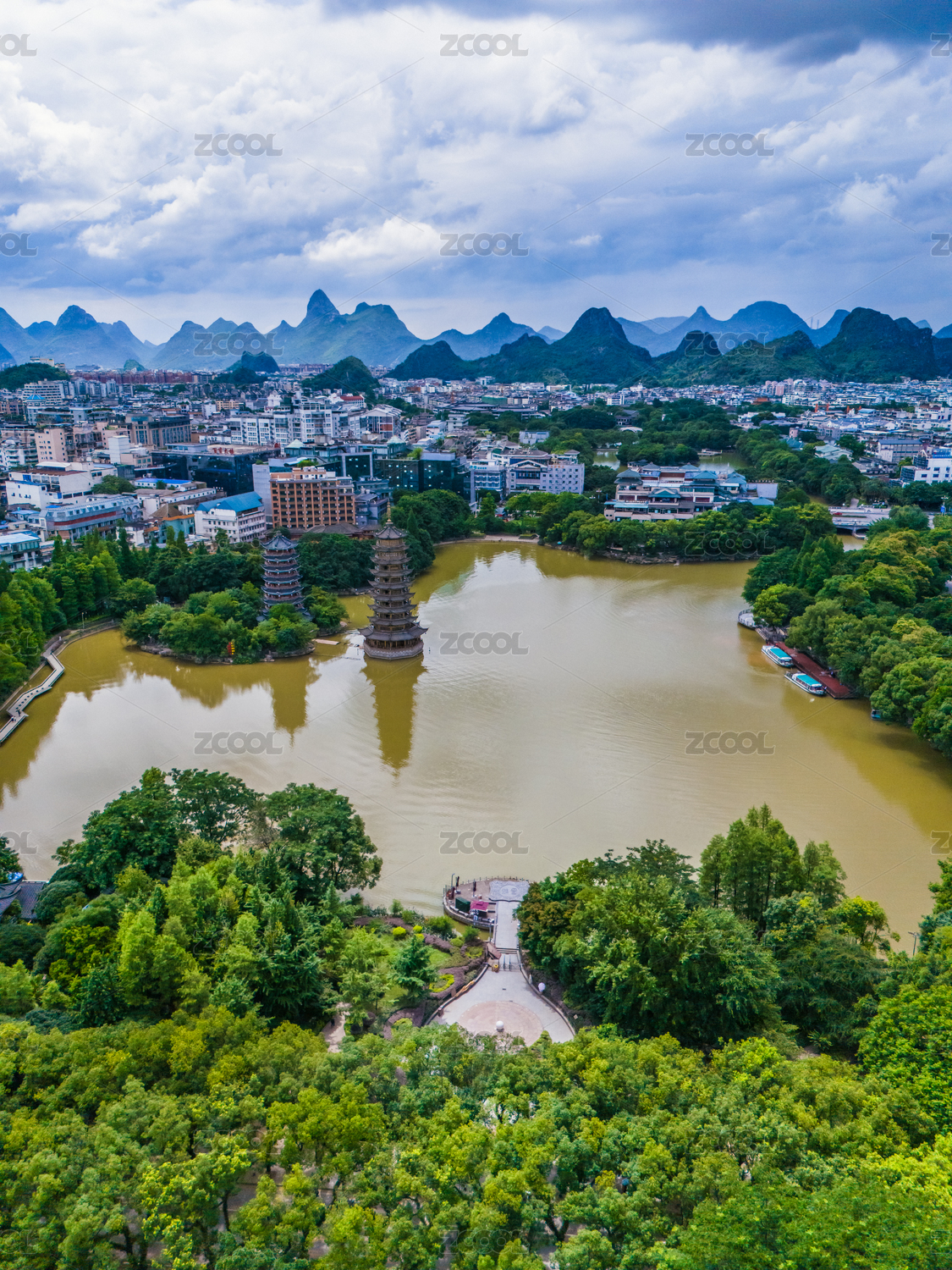 广西桂林叠彩山木龙湖航拍城市建筑风光