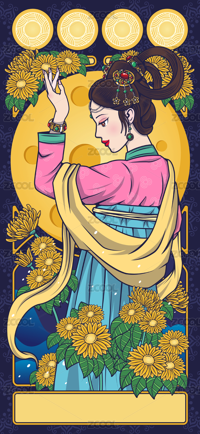 中秋节国潮国风女孩提灯笼飞天竖版插画