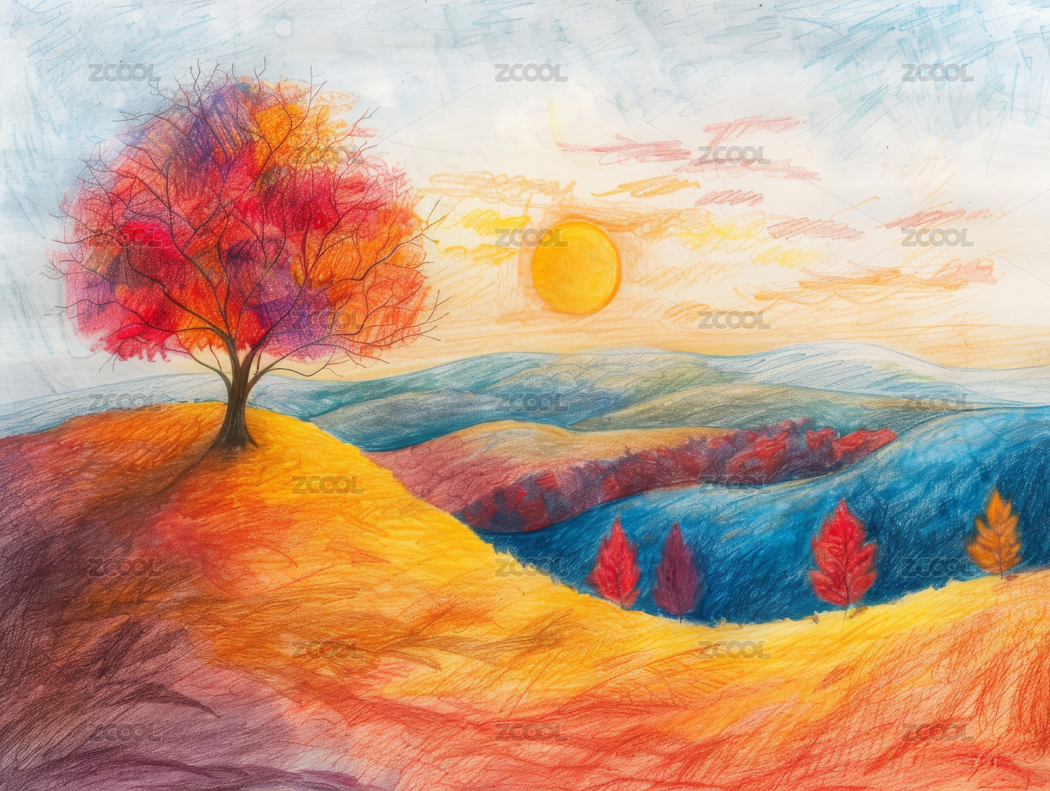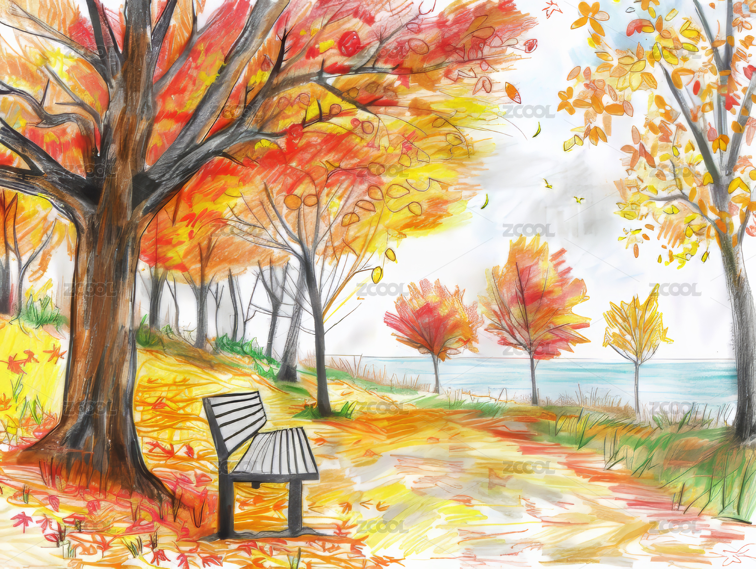 秋季,彩铅,秋景,秋天,艺术,治愈,创意,唯美,金色,黄色