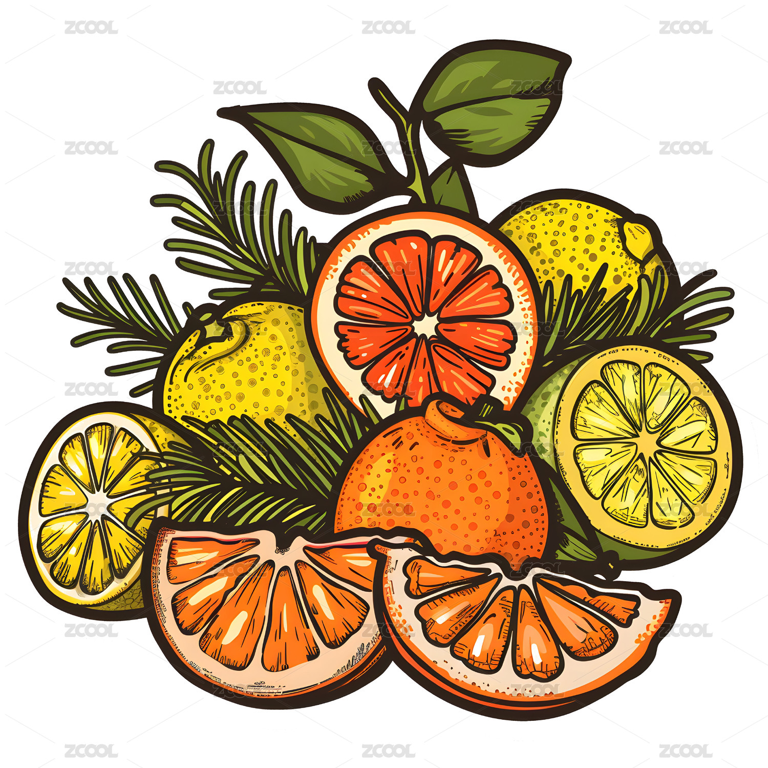 橙子片柠檬片薄荷叶卡通手绘插画线稿素材